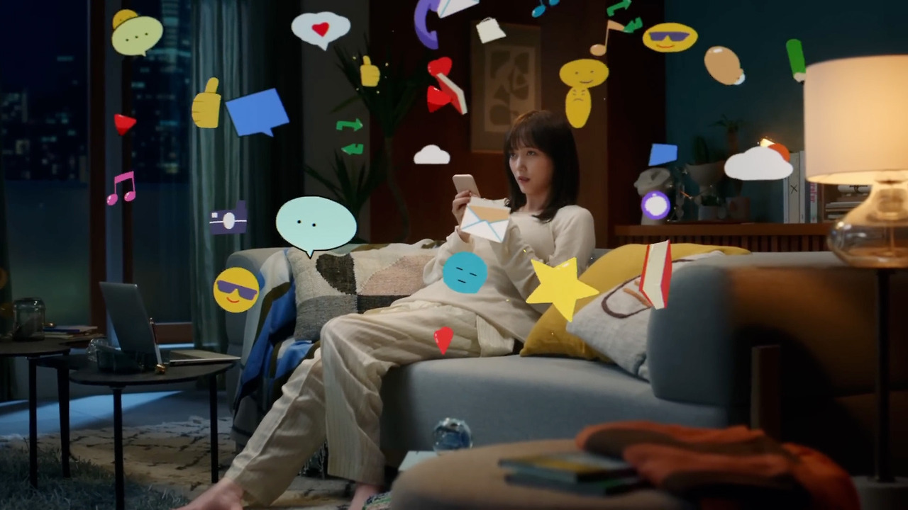 영상은 자신의 집 소파에서 스마트폰을 보고 있는 그녀의 모습으로 시작한다. SNS, 음악, 메시지, 게임, 동영상 등을 상징하는 수많은 아이콘들이 어지럽게 그녀 주변을 맴돈다.