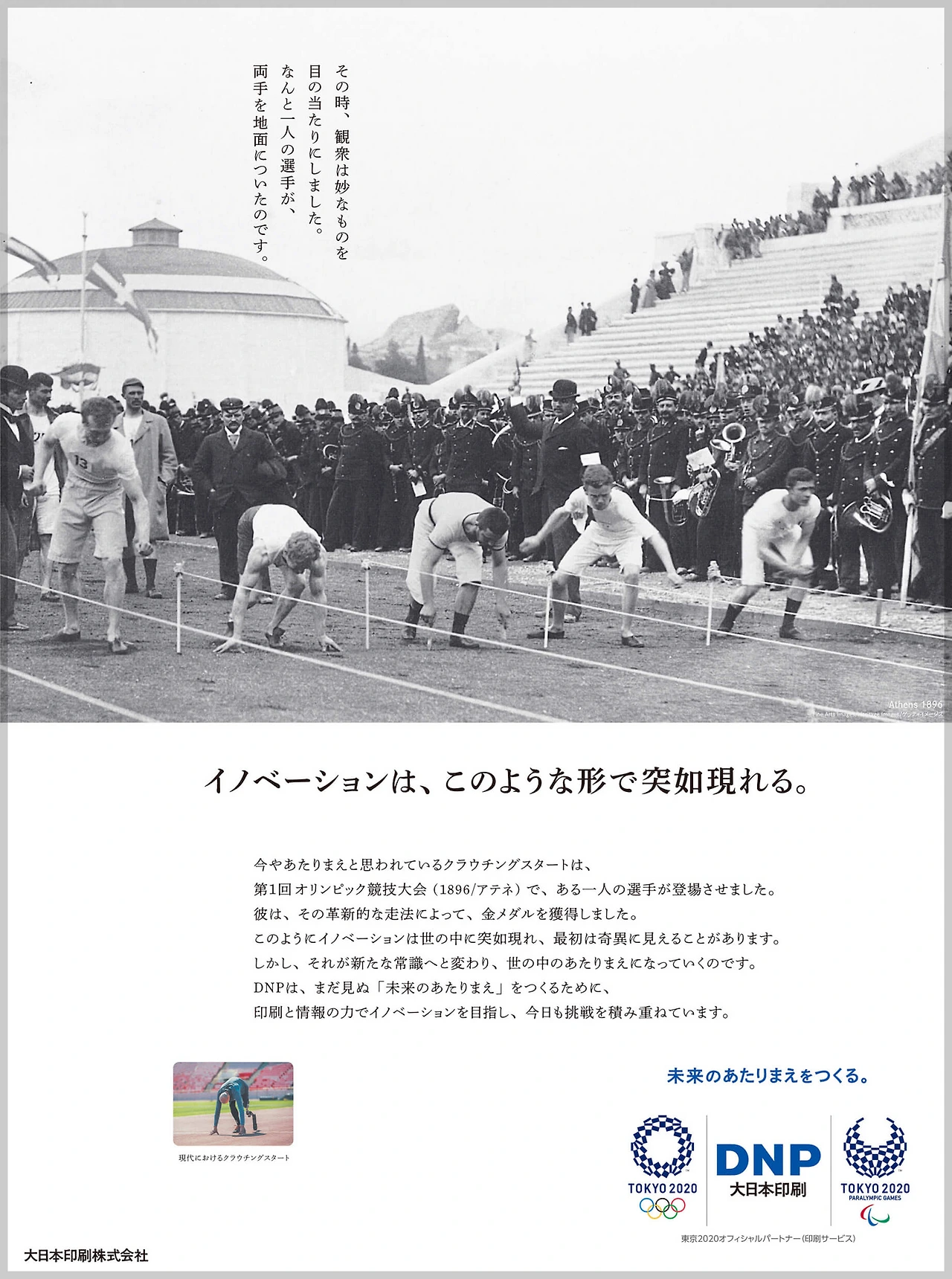 바로 이 점을 상징적인 이미지로 보여주는 광고가 있다. 1876년 설립된 인쇄회사 DNP(大日本印刷 :다이닛폰인쇄)의 신문광고다. 1896년 아테네 올림픽 육상종목의 출발직전 사진이 메인 이미지로 활용되었다.
