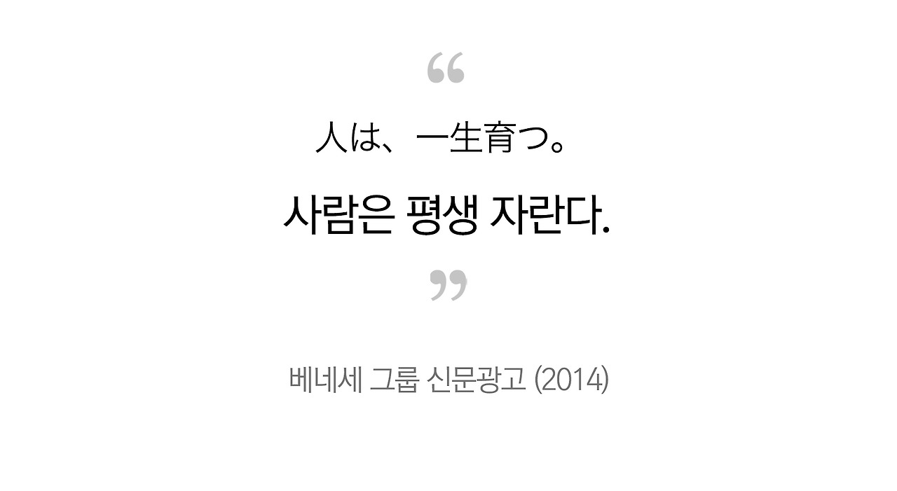 그 기억을 92세 박사님의 기사를 보며 떠올리게 된 것이다. 덩달아, 짧은 일본 광고의 카피 한 줄이 떠올랐다. 교육 및 간병 사업을 벌이고 있는 베네세그룹의 신문광고이다.