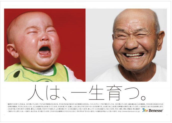 분할된 화면 양쪽에 아기의 얼굴과 노인의 얼굴이 대칭이 되어 보여진다. 아기의 우는 얼굴과 환하게 웃는 노인의 모습이 극명하게 대비되며 눈길을 끈다. 이 아기가 평생 자라서 오른쪽의 노인이 된다는 의미를 담으면서도 교육사업과 간병사업의 이미지를 동시에 보여주는 것 같다. 사진 아래에 ‘사람은 평생 자란다’는 헤드라인이 크고 깔끔한 타이포로 장식되어 있다. 그리고 이어지는 바다 카피가 광고의 의미를 뚜렷이 전달한다.