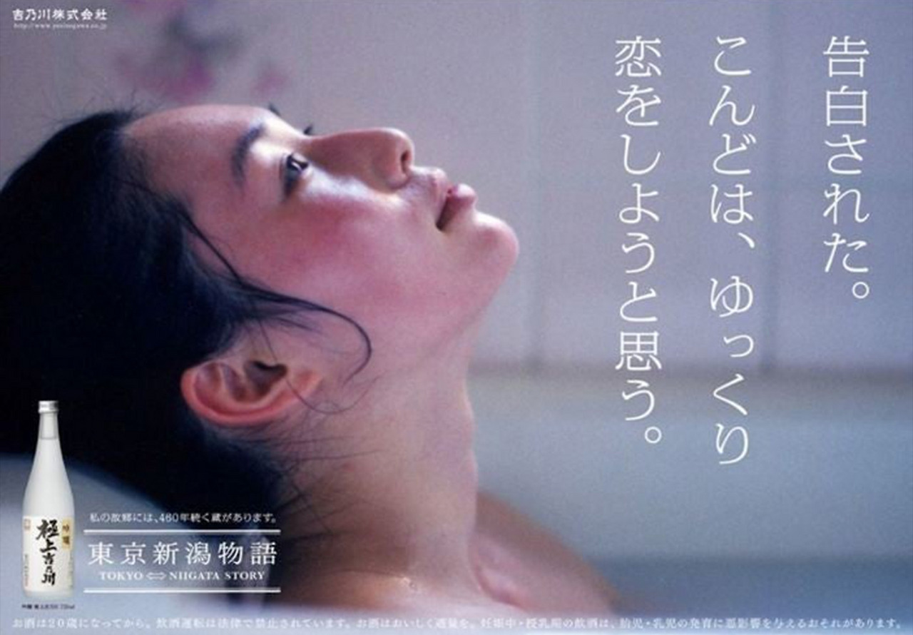 이 광고는 니가타현에 자리한 주류회사인 <요시노가와 양조>가 동경과 니가타 사이를 오가는 신칸센 열차 안에 시리즈로 게재한 것입니다. 니가타현 출신의 여성이 동경에서 취직해 지내면서 성장하는 이야기를 계절마다 광고로 연재했습니다. 가족, 취업, 사랑, 결혼 등의 이야기가 마치 한 여성의 성장 일기를 보는 듯합니다. 깔끔한 사진에 인사이트 있는 카피로 많은 사람들의 호응을 받았습니다.