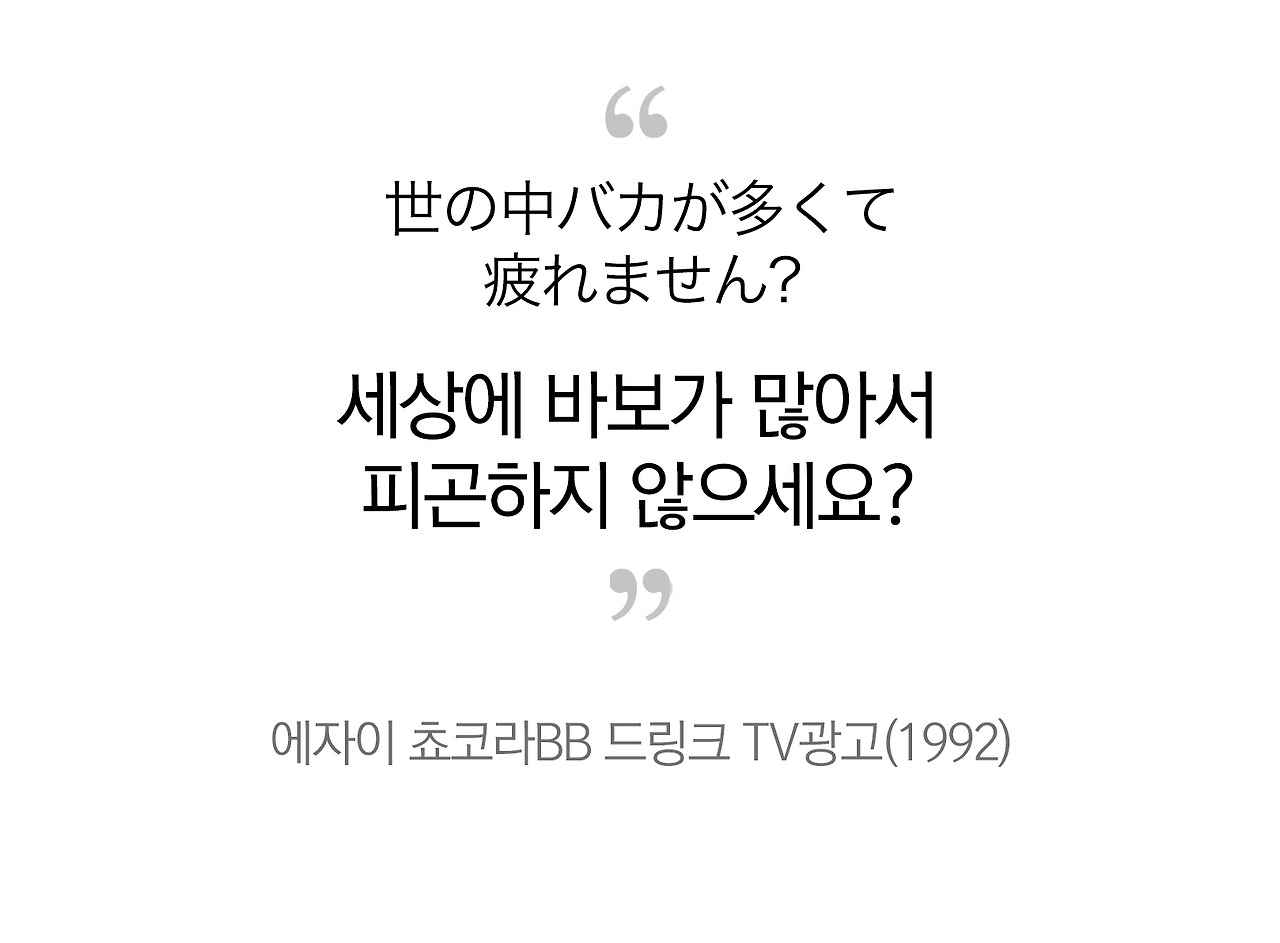 지금으로부터 30년 전쯤 온에어된 쵸코라BB 드링크의 TV광고 카피다. ‘비타민 B2 배합’, ‘육체피로시 영양공급 및 자양강장’등의 자막을 보니 ‘비타500’류의 드링크제인 것 같다. 고수부지의 풀밭에 쭈그리고 앉아 있던 여성이 갑자기 화면을 바라보면서 “세상에 바보들이 많아서 피곤하지 않으세요?”라고 물어보는 게 광고의 전부다.