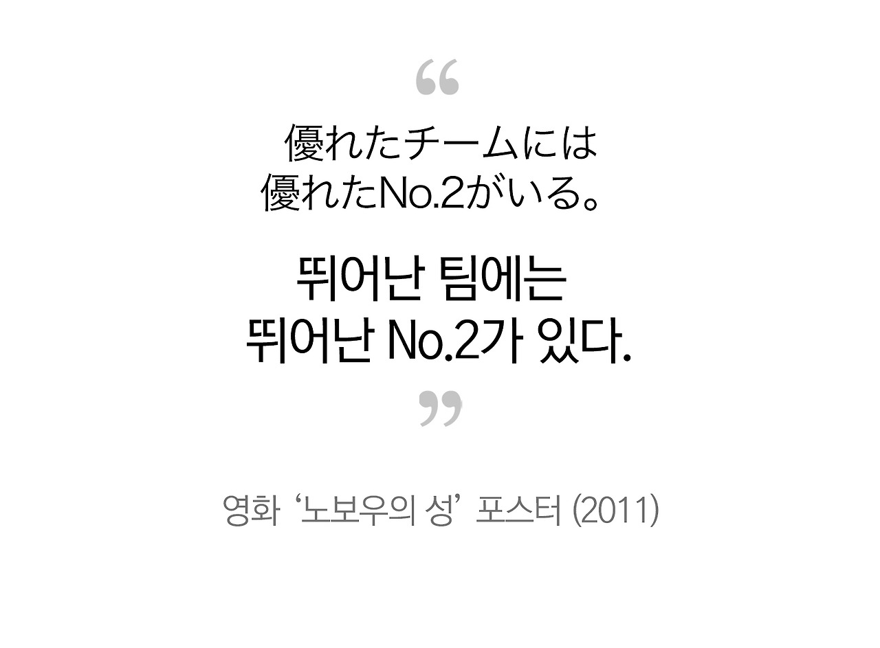 생각해보면, 2인자들은 수많은 역할을 담당해야 한다. 리더가 올바른 판단을 할 수 있도록 조력을 하고, 그를 대신해 궂은일도 직접 해야 한다. 리더와 팀원들 간의 원활한 소통의 창구가 되기도 하며, 경우에 따라서는 리더의 책임을 대신 지기도 한다. 때론 자신의 실력을 통해 1인자에게 건강한 긴장감을 불어넣기도 한다. 좋은 2인자가 좋은 1인자를 만들고, 결국 그 리더십으로 좋은 팀을 만드는 사례도 많을 것이다.