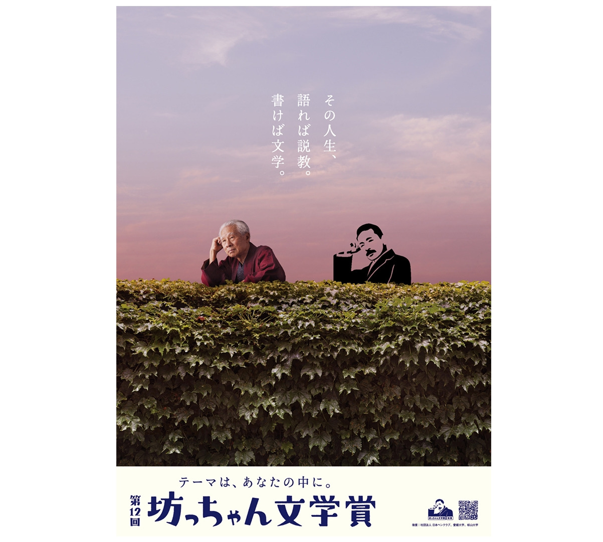 제 12회 도련님(坊っちゃん) 문학상의 포스터 문구다. 이 문학상은 소설 ‘도련님’의 배경으로 나온 마쓰야마(松山)시가 시 승격 100주년을 맞이하여 만든 것으로 도시의 문화적 이미지를 높이기 위해 제정된 것이라 한다. 일본 근대문학의 아버지라고 불리는 소설가 나쓰메 소세키(夏目漱石)를 기념하는 문학상의 포스터답게, 횟수를 거치면서 멋진 카피들로 주목을 끌었다. 그 중 12회 공모를 알리는 카피는 2011 TCC(도쿄 카피라이터스 클럽) 카피연감에 등재되며 작품성을 인정받았고, 카피라이터 반도 히데키(板東英樹)씨는 그 해 도쿄 카피라이터스 클럽 심사위원장 상을 받았다.