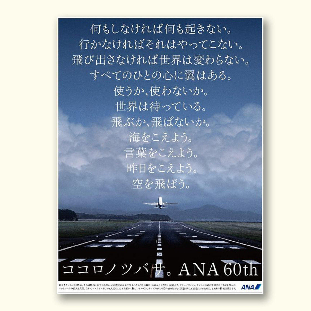 일본의 민간항공사 ANA(전일본공수) 60주년 기념광고의 카피입니다. 제가 좋아하는 나이키의 슬로건 "Just do it"의 이유를 알려주는 것 같습니다. 너무 당연한 말인데, 가슴을 치는 힘이 있는 좋은 문구입니다. 이렇게 마음을 움직이는 좋은 카피와 함께 있으니, 평이해 보일 수 있는 마음의 날개(ココロノツバサ)라는 슬로건이 왠지 모르게 역동적인 느낌마저 듭니다.