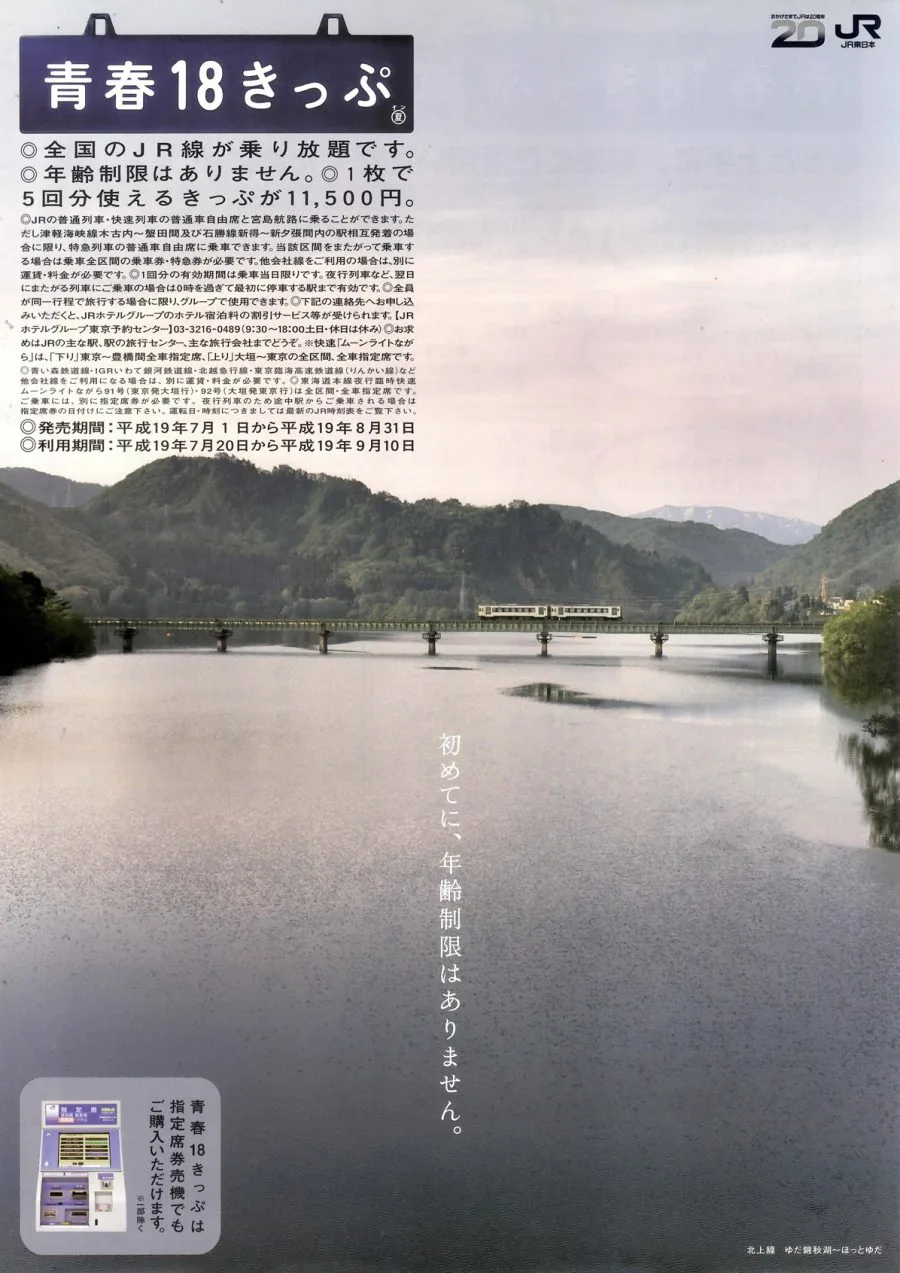 2007년에 게재된 JR의 청춘18티켓 광고이다. 청춘18 티켓은 표 한장으로 5일 동안 신칸센과 급행을 제외한 보통등급의 열차를 무제한으로 탈 수 있게 한 상품이다. 실제로는 모든 연령의 고객이 다 사용할 수 있지만, 청춘18이라는 컨셉과 네이밍은 고등학교를 막 졸업하고 대학생, 사회인이 되는 젊은이들을 타겟으로 한다. 그래서, 광고 캠페인도 젊은 시절 세상을 마주하고 여행하는 것이 중요하다는 것을 말해주는 내용이 많다.