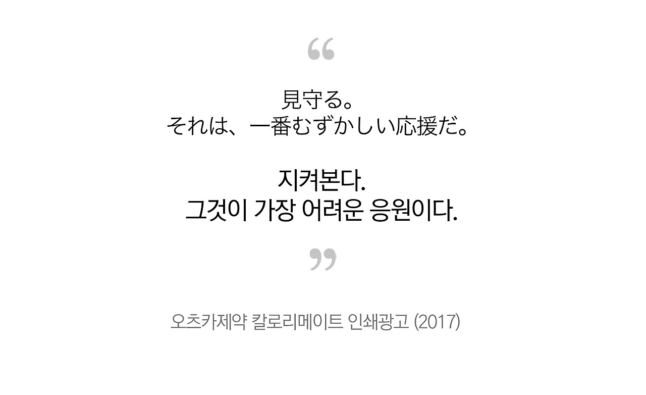 見守る(みまもる:미마모루). 우리말 뜻인 '지켜본다'처럼 본다(見:볼 견)와 지킨다(守: 지킬 수)는 의미의 한자가 어우려져 있다. ‘지켜 서서 본다’는 뜻일까. 그런데, 안타까운 엄마의 눈빛과 어우러져 있으니 상대방을 지키고 싶은 간절한 마음이 담긴 것처럼 다가 온다. 헤드라인에 이어지는 바디카피는 이 마음을 잘 설명해준다.