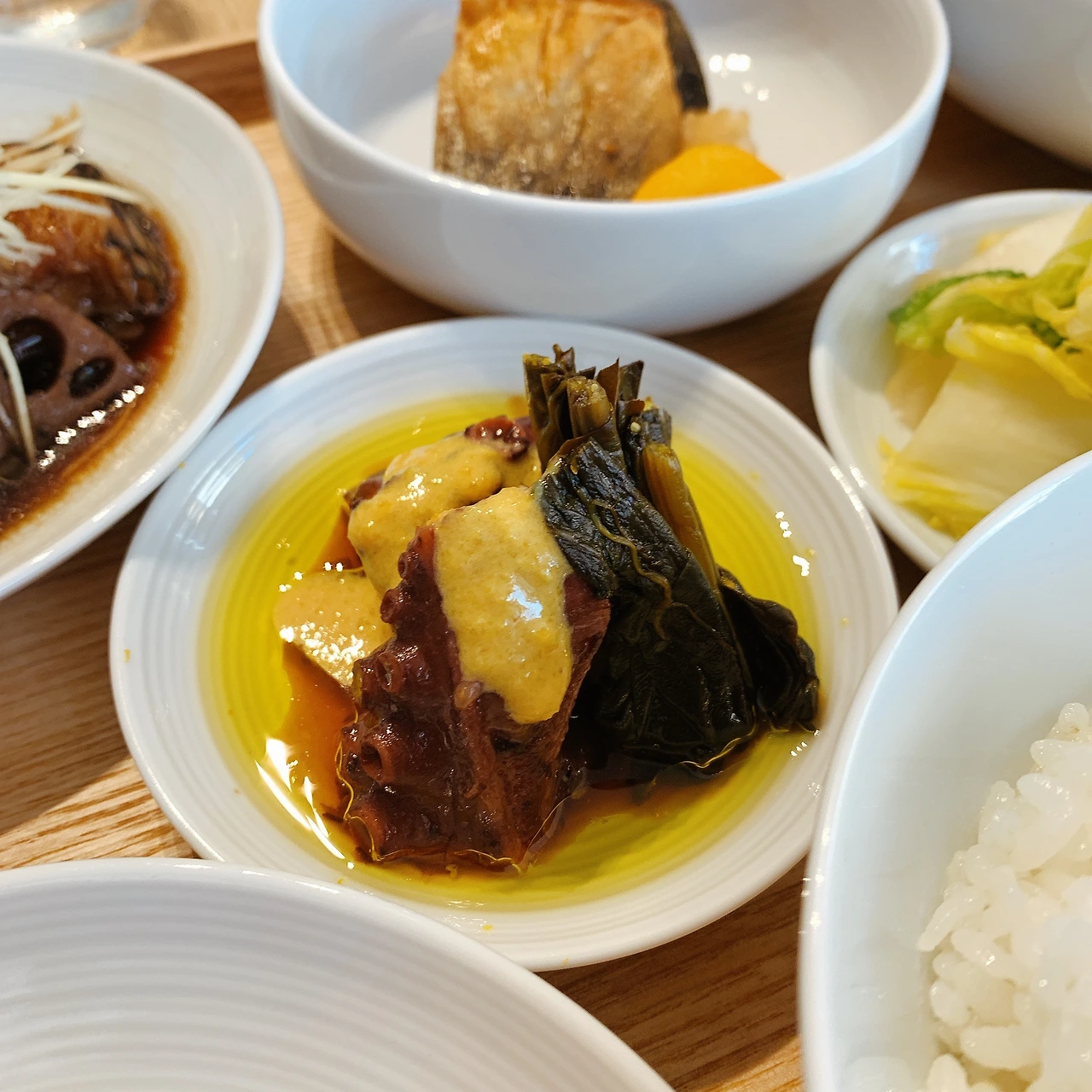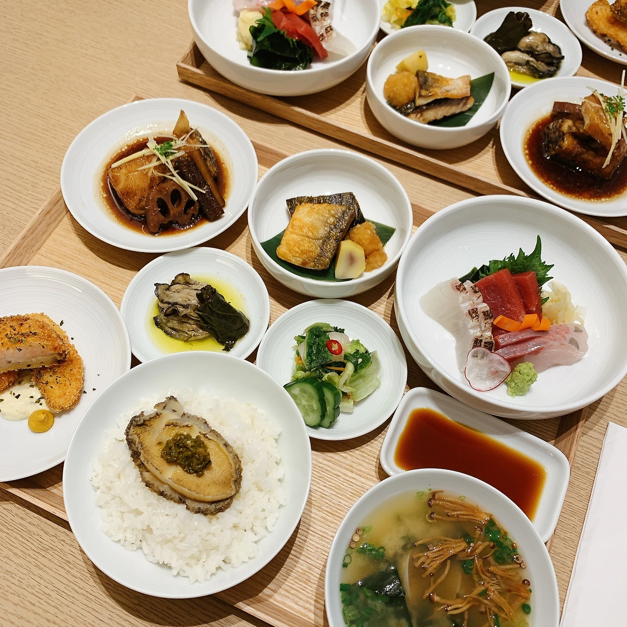 그리고 이 밥 위에 올려진 전복과 내장. 찰진밥과 같이 먹으면 세상 꼬숩다. 아무래도 밥 지을때 뭔가 다른 물을 넣는 것 같다. 한국에서 밥 젤 잘한다는 쿠쿠도 저런 밥은 못 만들던데 이건 분명 물이다. 여하튼 밥과 함께 먹기 좋은 반찬들은 모두 다 맛깔나지만 메로조림 이런건 아는맛이라 그냥 맛있는거고 나의 원픽은 굴절임. (봄이 되어 지금은 문어절임이다) 올리브유에 해산물을 절여 먹는건 상상도 못해봤는데 꽤나 조화롭다. 글고 같이 절인 저풀... 시래기인듯 아닌듯 뭔가 다른거 같은데 애니웨이, 그것도 밥이랑 먹으면 너무 색다르고 맛있다.