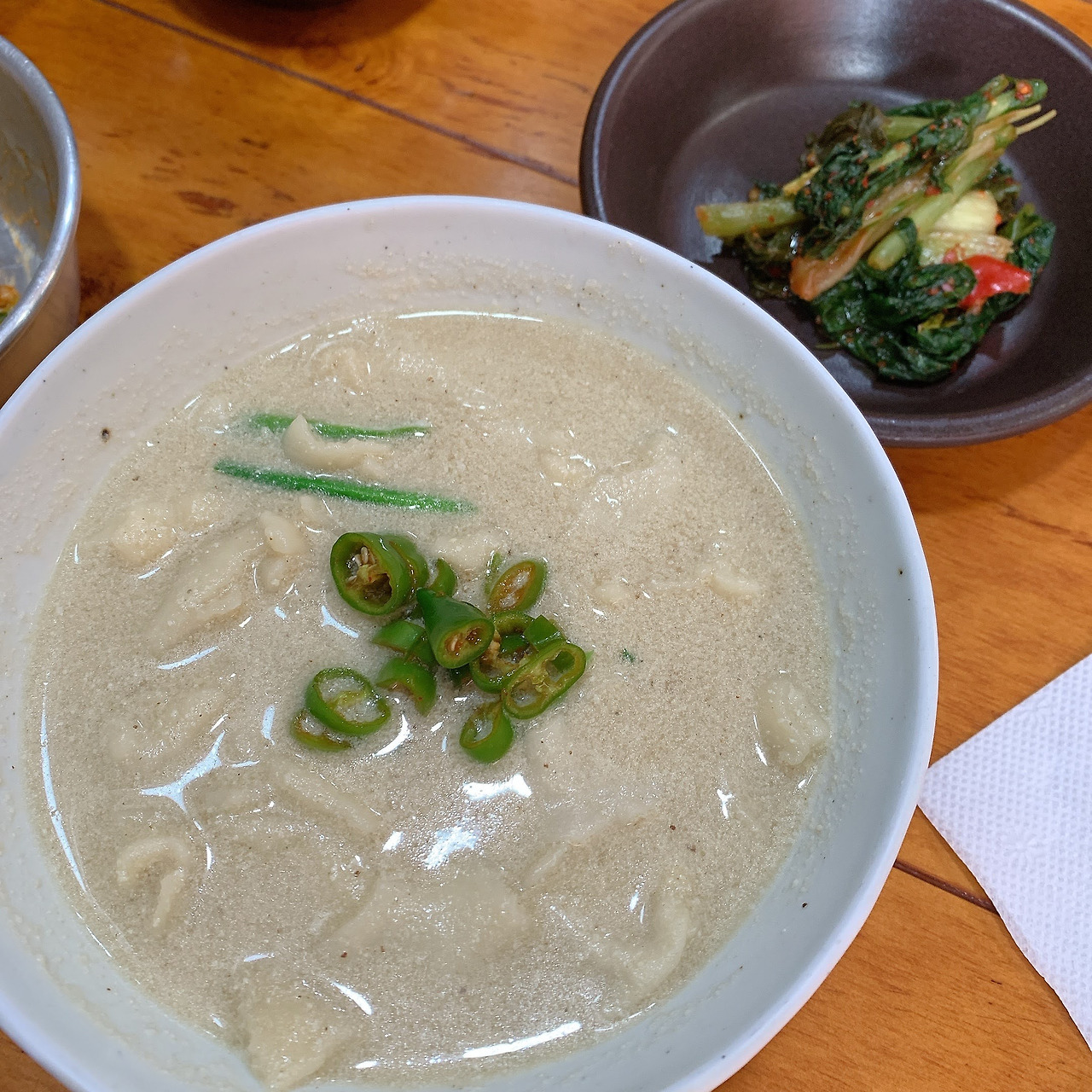 수제비는 감자 수제비, 미역 수제비, 들깨 수제비 이렇게 있다. 항상 감자 수제비 또는 들깨 수제비만 먹어서 미역 수제비는 어떤 맛인지 모르겠지만 같은 베이스 국물로 만드는 거면 무조건 맛있을 거다. 국물은 투명한 색을 띠고 있지만 굉장히 진하고 깨끗한 멸치맛이다. 여기에 고추 절임을 넣어 먹으면 국물이 더 시원해지고 감칠맛이 더해진다.
