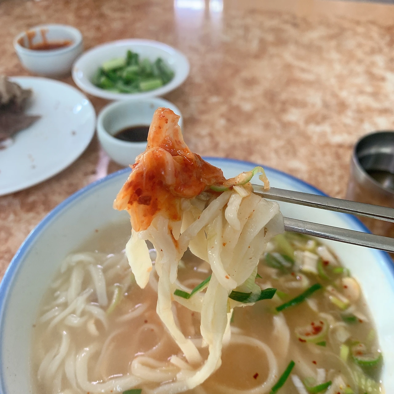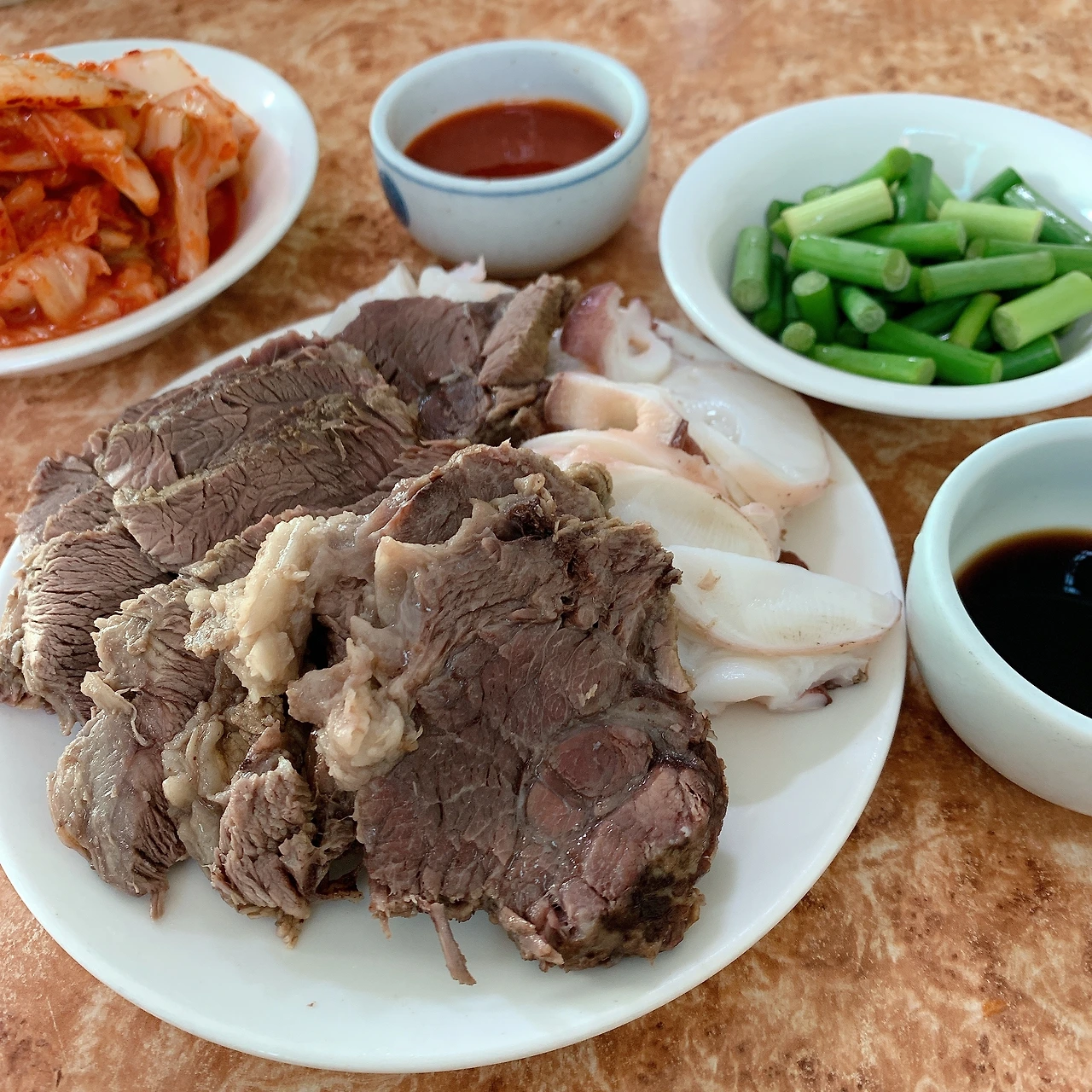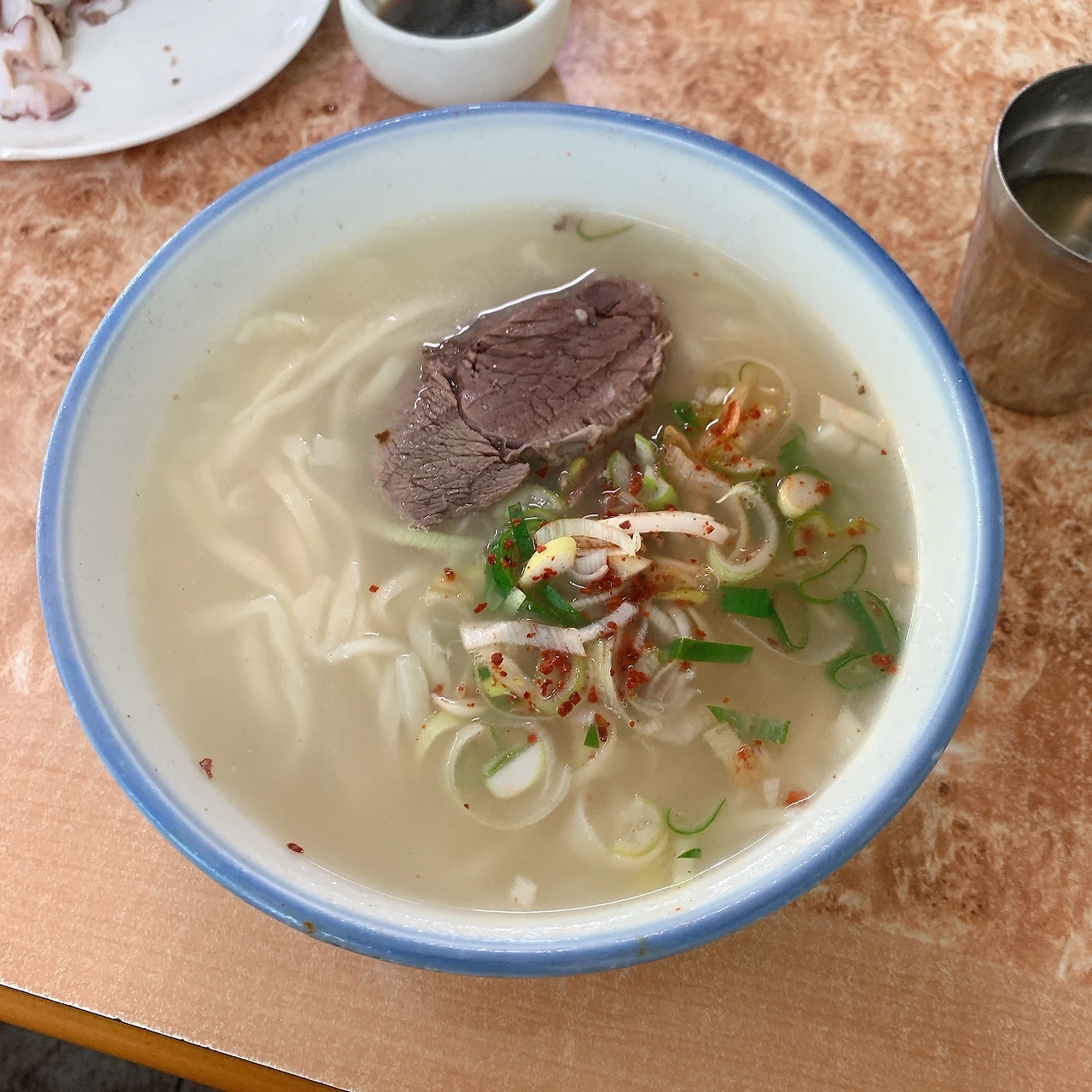 노부부가 운영하는 이곳은 안동국시같이 진한 소고기 국물을 베이스로 한 칼국수집이다. 소고기를 국물로 내니 수육도 당연히 있다. 수육과 문어숙회 반반도 주문해본다.