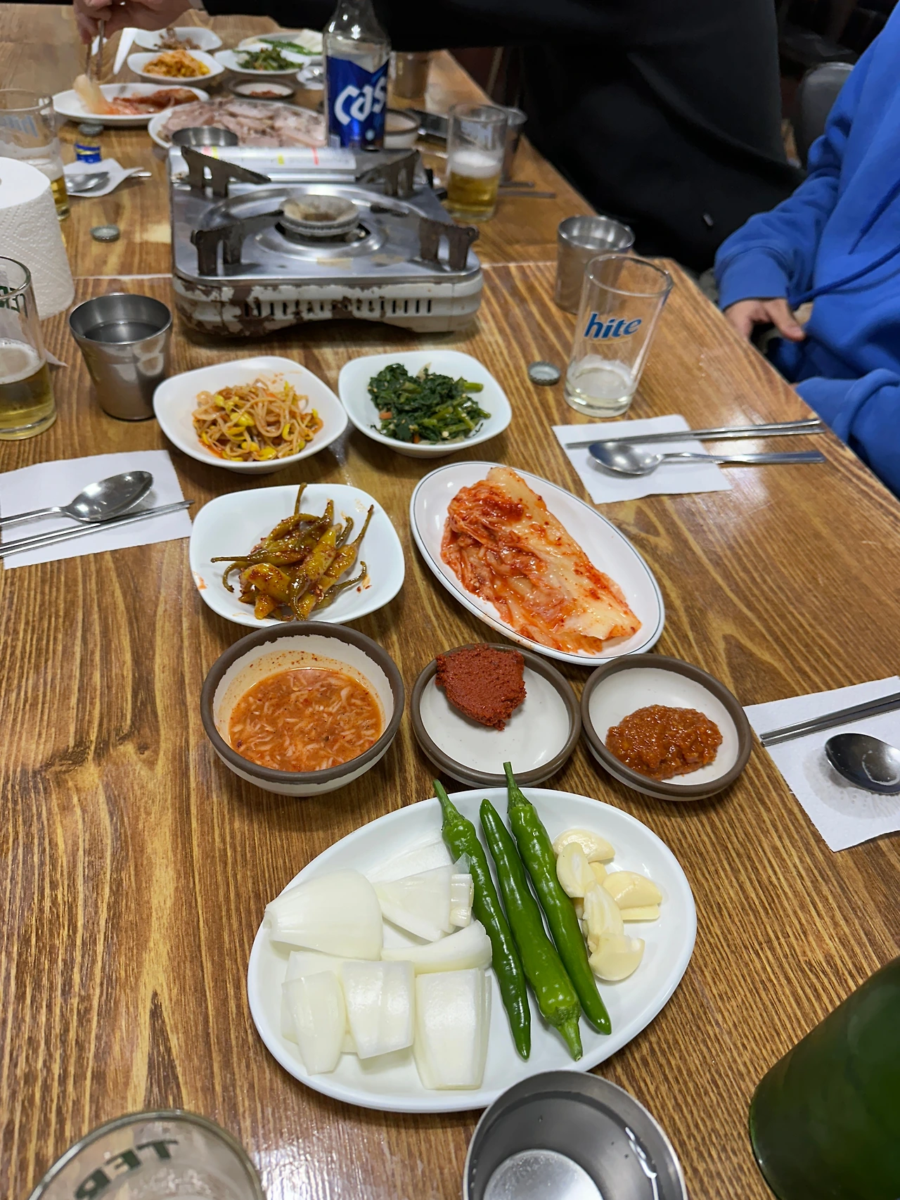 전골과 머리 고기를 시켜서 그런지 평소보다 찬이 조금 더 나오는 느낌이다.