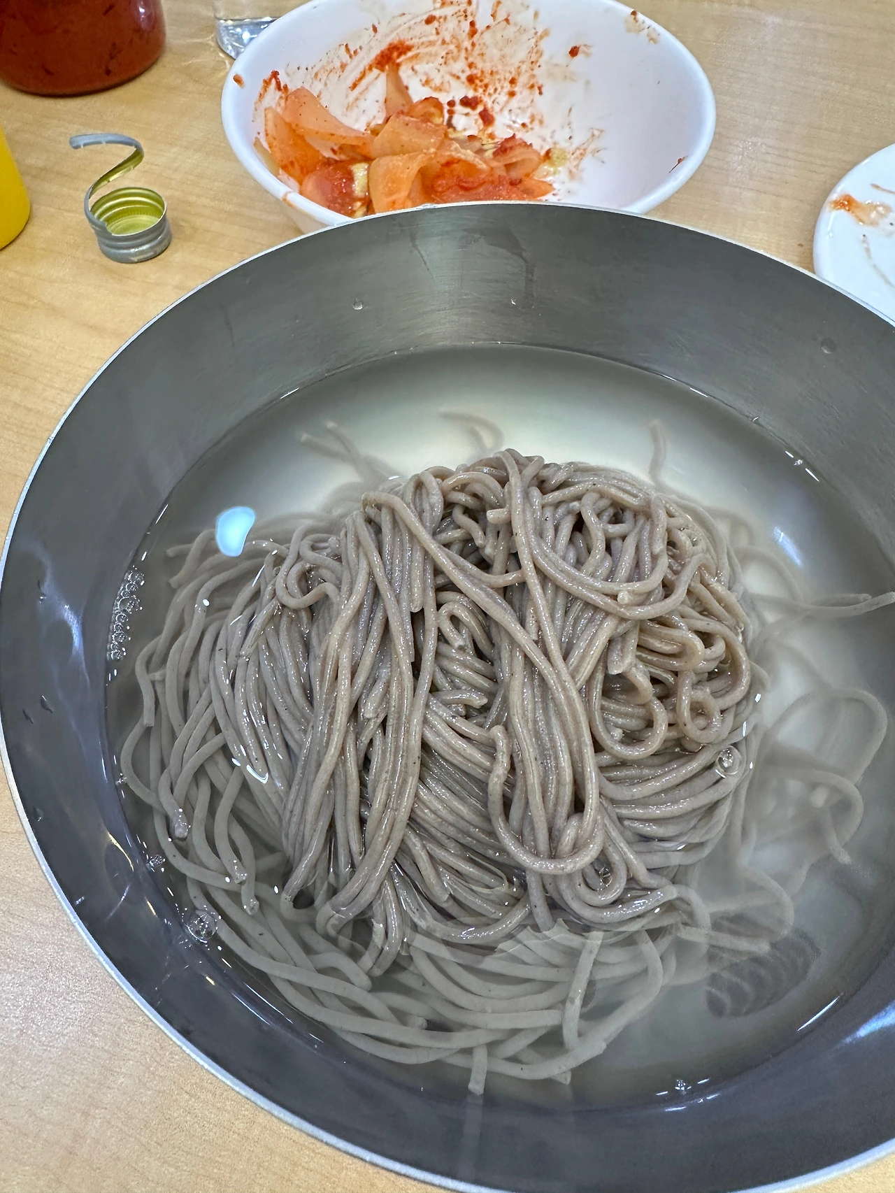 제육을 반쯤 비웠을 때, 물 막국수가 나왔다.