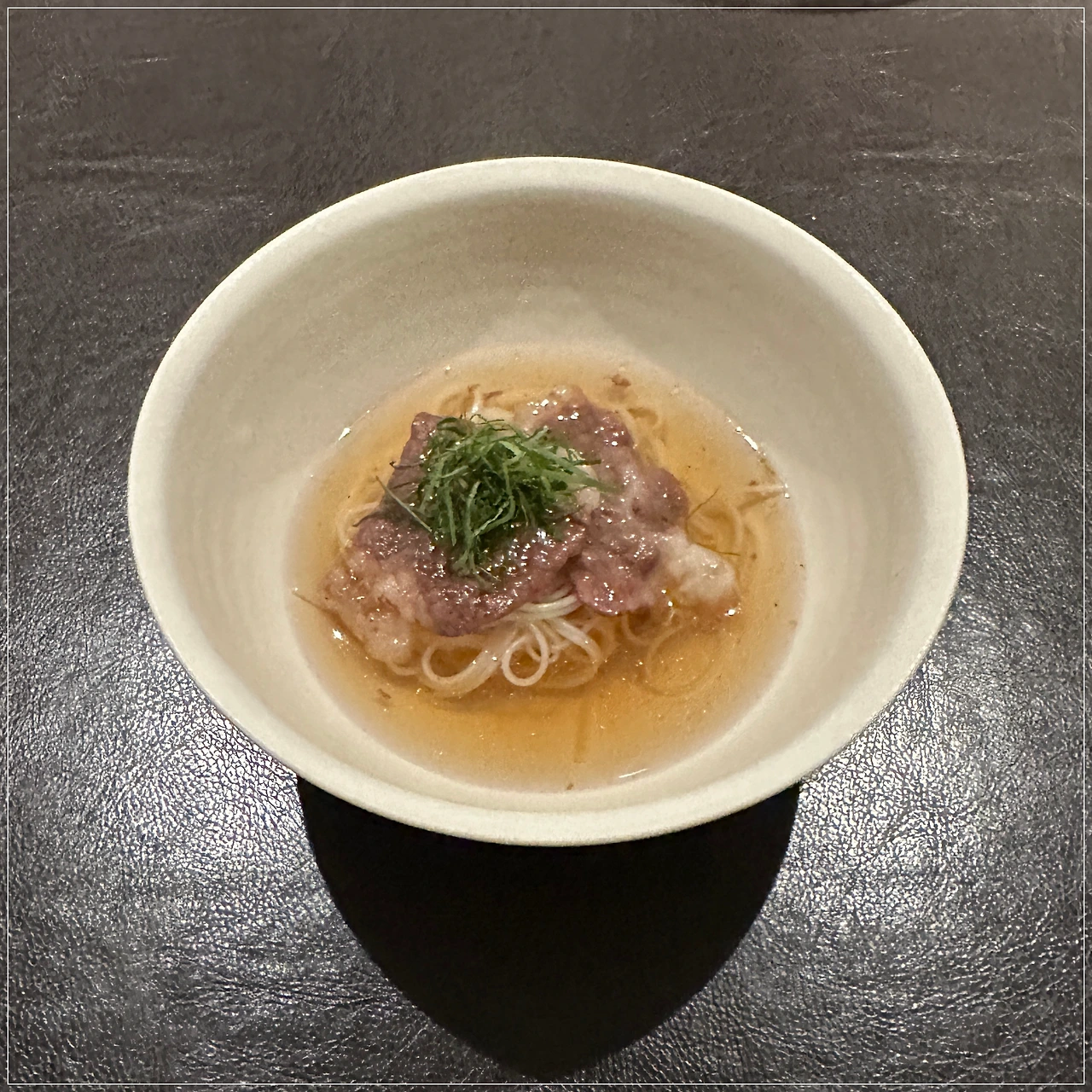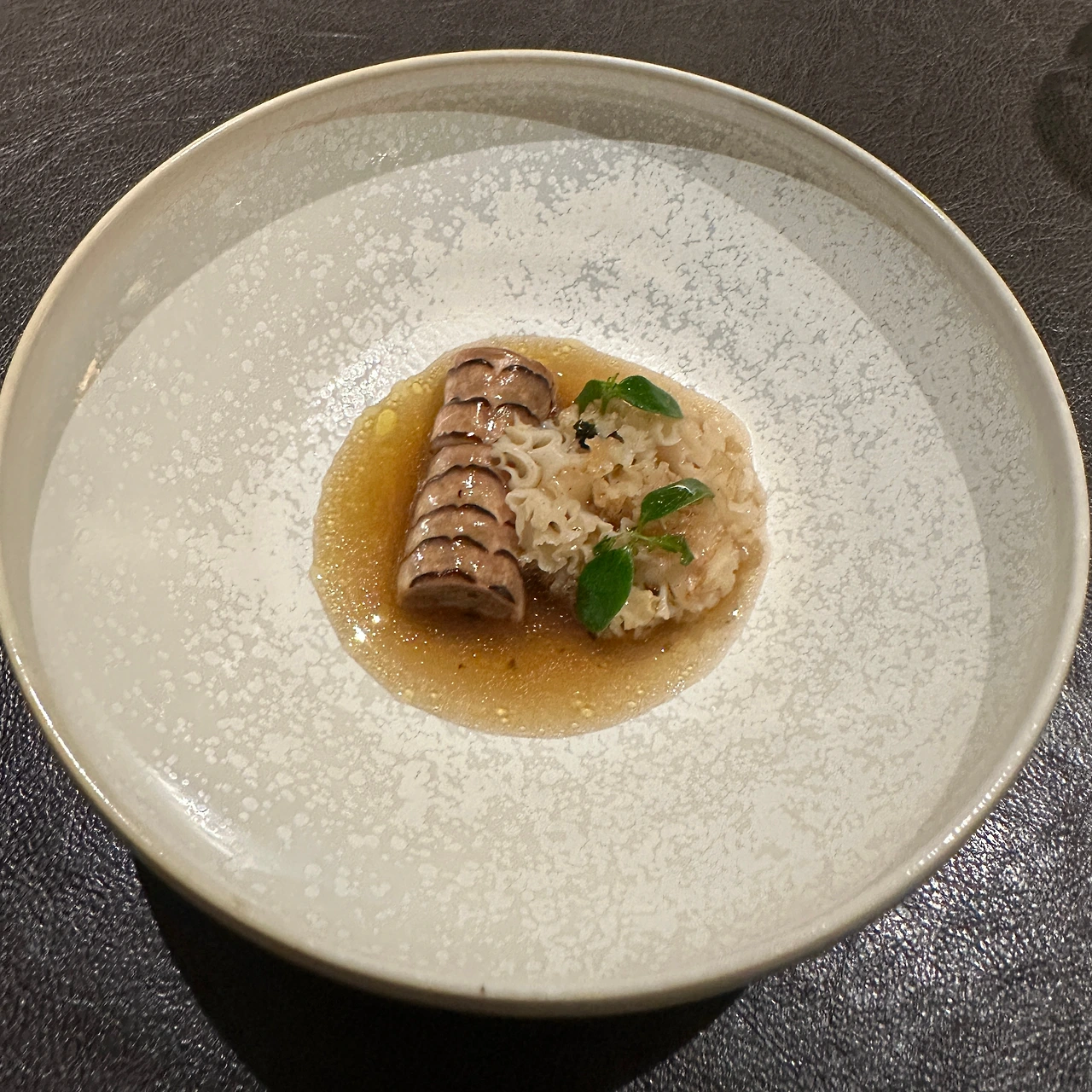 가을 버섯과 소고기로 만든 롤에 양지 육수를 곁들여 준다.