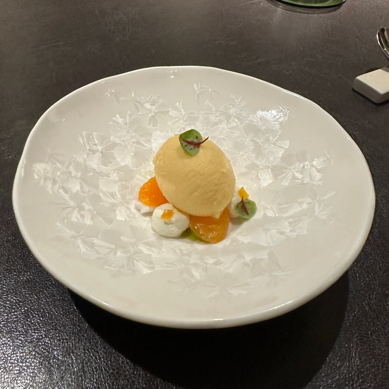 메인 디저트는 우유와 통카 빈으로 만든 아이스크림 위에 구워서 말린 우유 조각이 가니쉬로 나왔는데