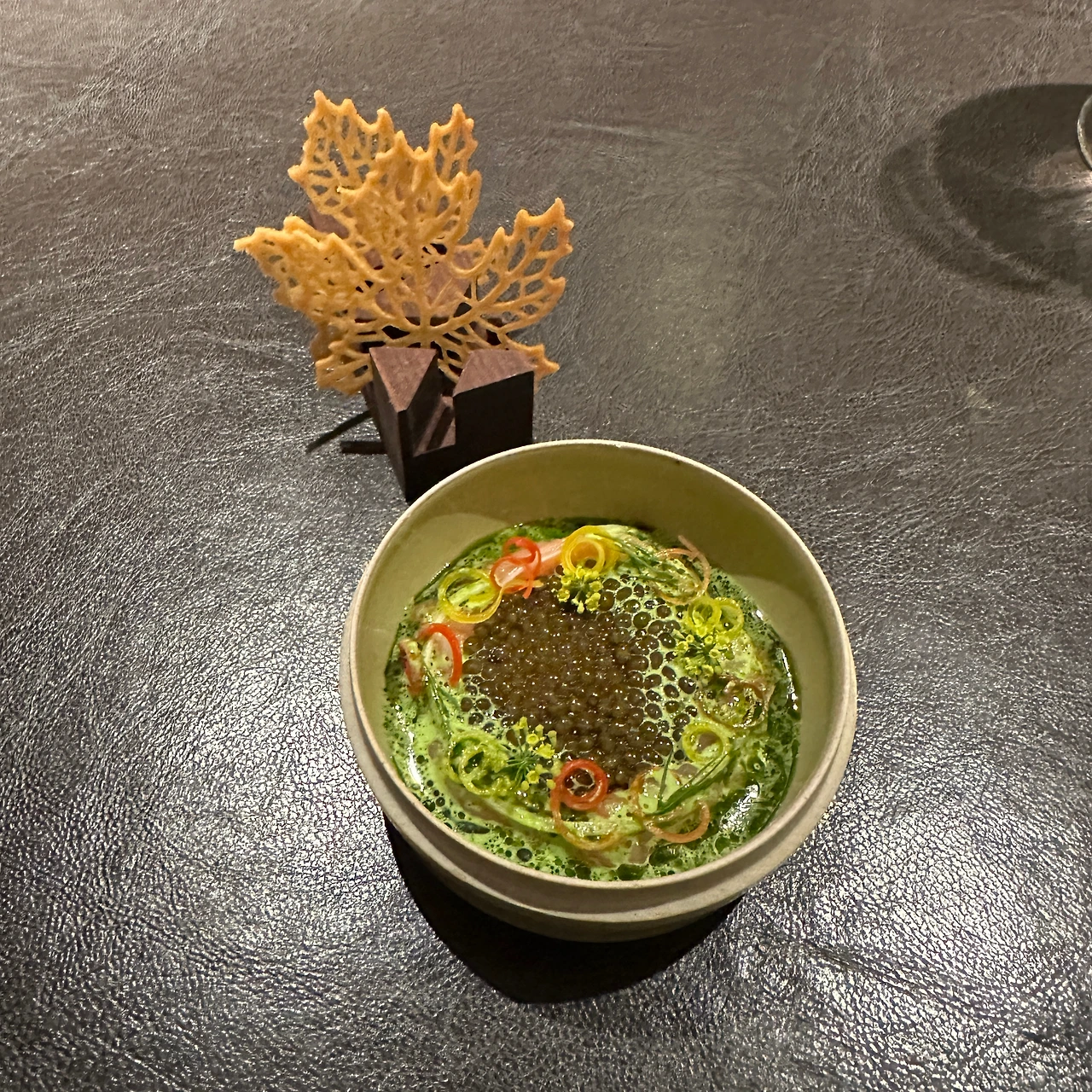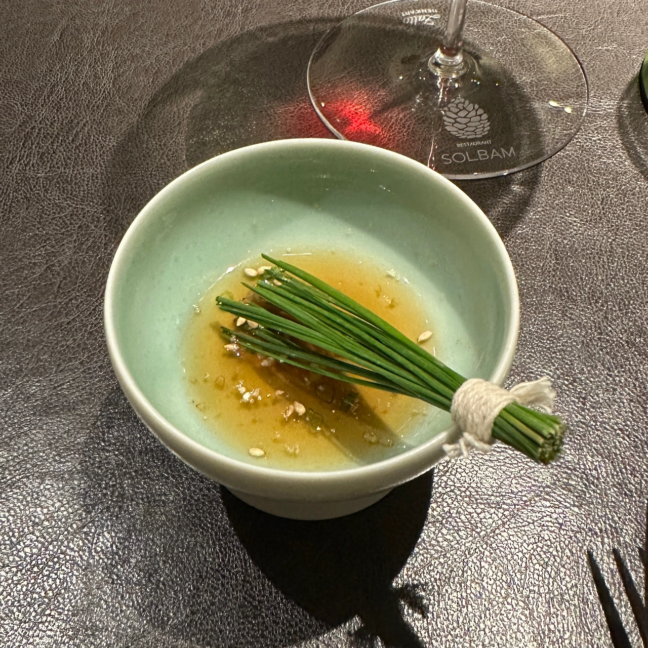 가니쉬로는 볶은 우엉이 함께 나오고 여수산 액젓에는 솔잎으로 만든 붓이 제공되어