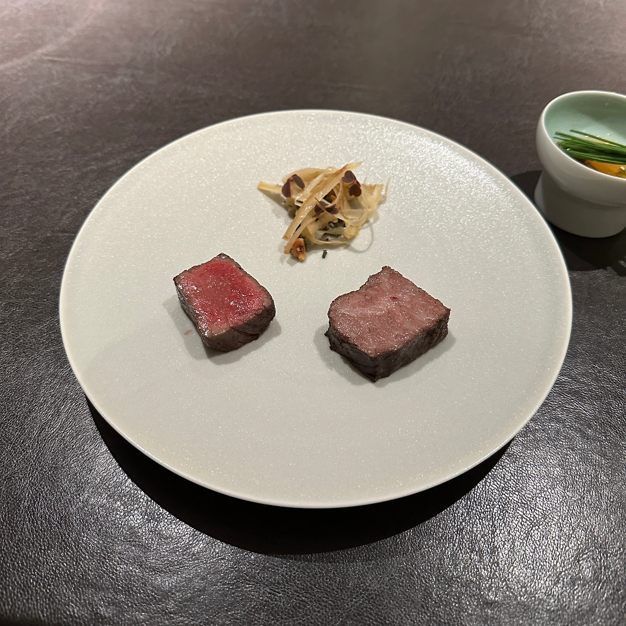 < 플레이팅 되어 나온 솔밤의 스테이크와 곁들여 나온 여수산 액젓 >