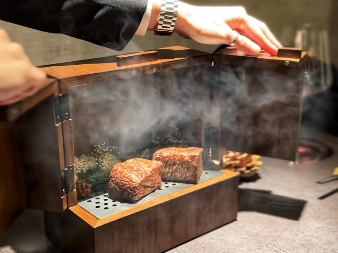 담당 서버분께서 설명과 함께 상자를 열면 솔향을 담은 한우 스테이크가 모습을 드러낸다.
