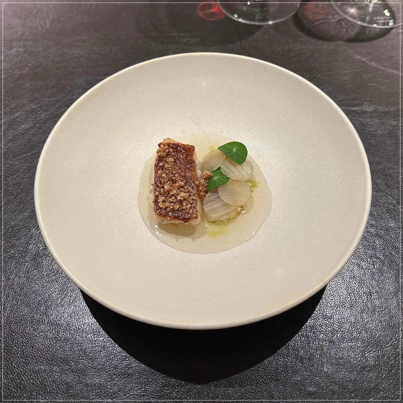 금태 위에 올려진 바삭한 크럼블이 전체적으로 수분이 많은 요리에서 부족한 식감을 완벽하게 채워준다.