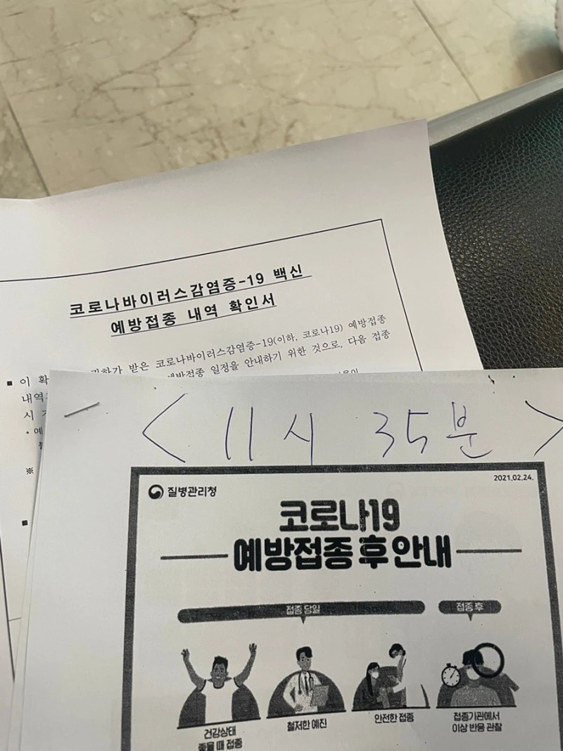 접종 병원에 갔더니 생각보다 사람이 많지 않았다. 접수를 하고 예진표를 작성하고 금방 맞겠지 했는데 접종 예정 시각보다 약 15분 정도 대기를 했다. 그러다가 드디어 백신 주사를 맞았는데 맞는 건 채 2초도 안 걸렸던 것 같다. 응? 주사를 꽂기는 했나? 싶을 정도였다. 지난 주말 소아과에 가야지 주사 살살 놓아 준다는 친구의 말에 '아 왜 이제서야 알려줬냐고' 했던 말이 너무나도 무색하리만큼 후딱 지나갔다.