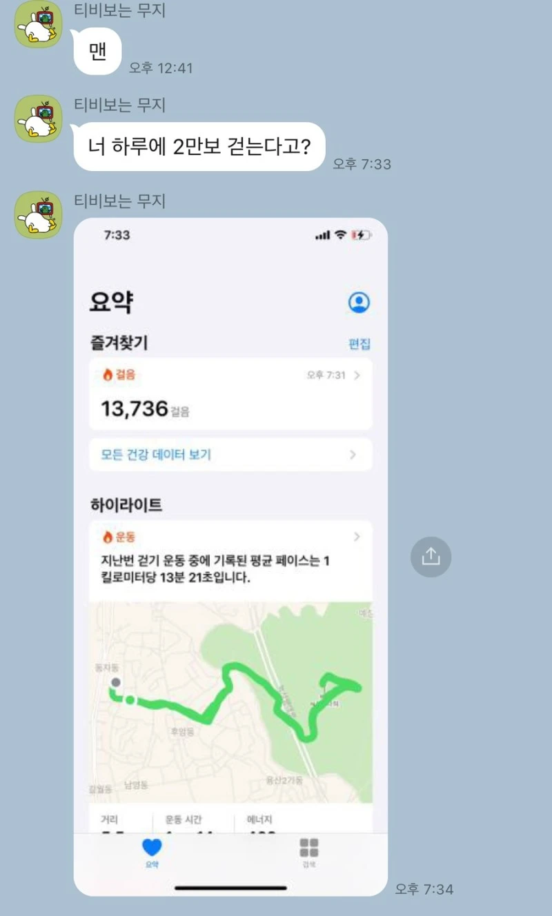​최근에 내 걷기 기록을 캡처해서 친구에게 보내줬다. "나도 힘들어서 뛰는 건 포기했고 걷기라도 해야겠다. 너도 운동할 시간 없으면 걸어라."