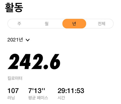 2. 달리기를 시작했다. 올해 242.6km를 뛰었다. 나는 뛰기에 재능이 없음을 확인했다. 달리기를 그만뒀다.