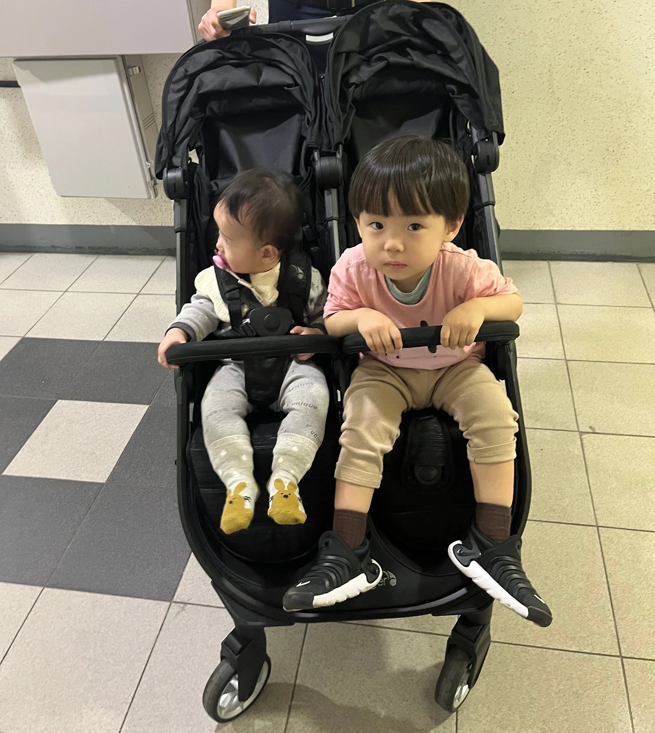가로폭이 다른 거에 비해 좁아서 애들은 비좁아도 다니기에 훨씬 수월하여, 문 통과하기나 엘리베이터 이용에도 훨씬 용이하단다. 원이에게 너무 끼이지 않다면 둘이 타고 이동성이 좋아 아주 편리할 것 같다.