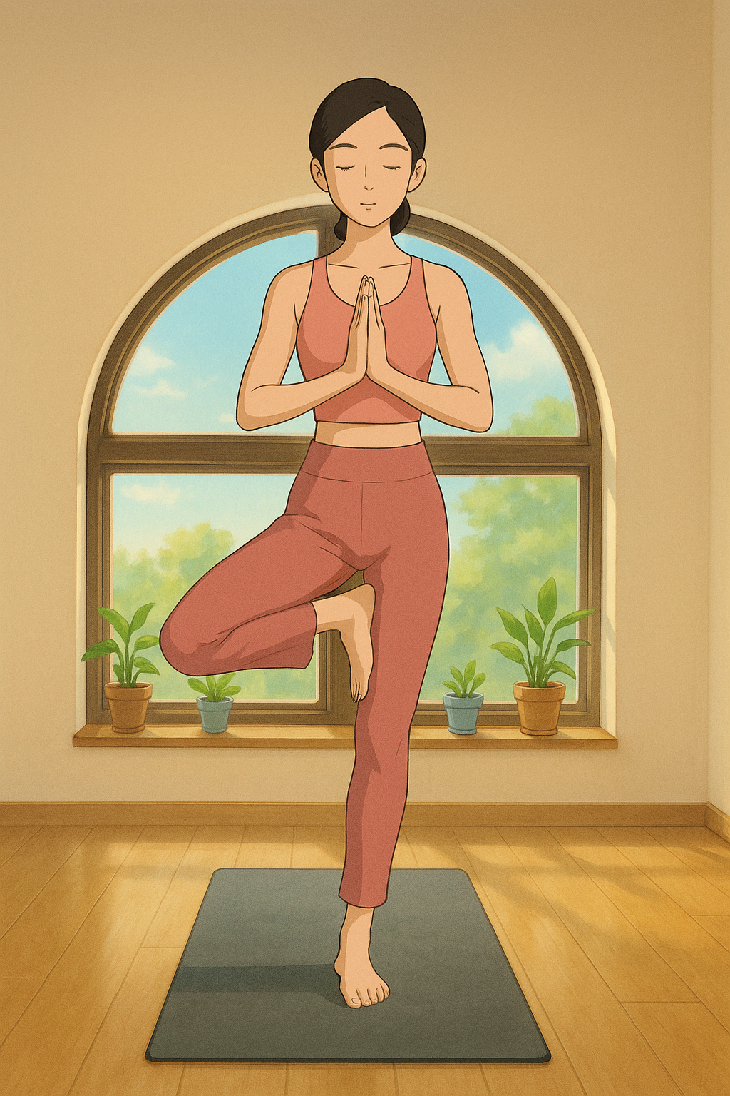 그녀는 흔들리며 아사나를 하고 있는 지금의 모습이 매트 밖에서 생기는 모순된 마음들과 같다는 생각을 했습니다.