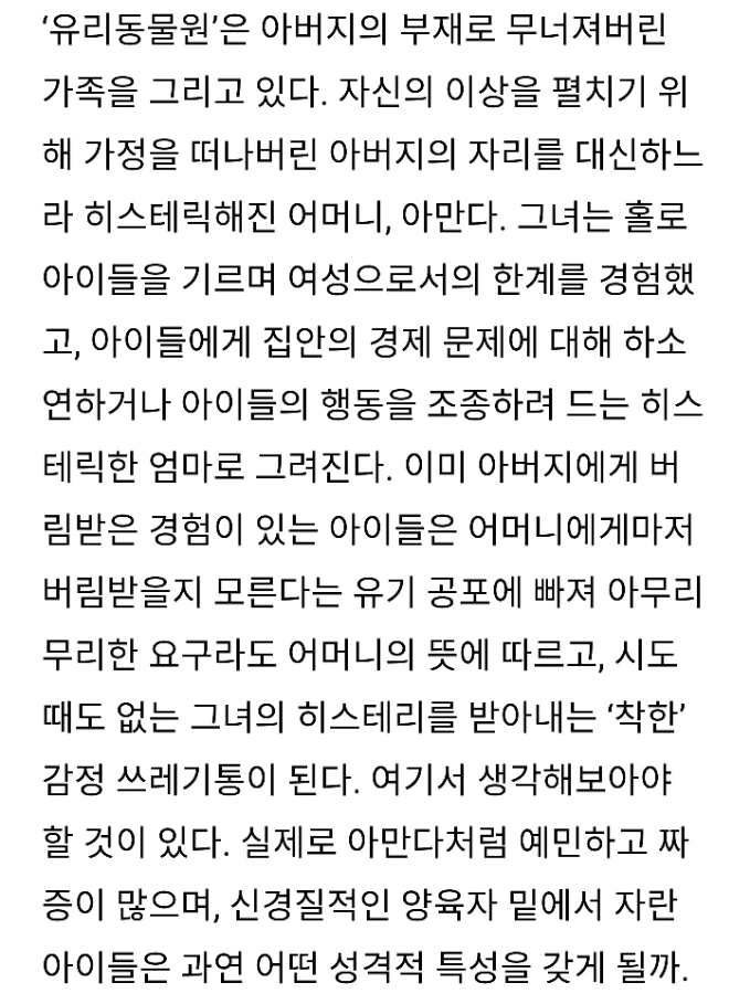 국립 극장 월간지 <미르> 8월호에 칼럼이 실렸다.미국의 대표적 극작가 테네시 윌리엄스의 <유리동물원>이라는 작품에 대해 글을 썼다.극 중 어머니로 등장하는 인물인 아만다의 성격을 심리학적으로 분석하는 내용이니, 연극과 희극, 그리고 심리학과 문학에 관심이 있는 독자분들은 아래 링크에서 전문을 읽어 보시길 바란다.