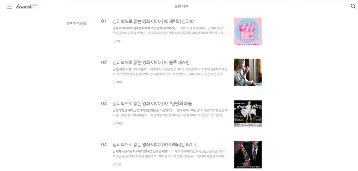 [브런치북] 심리학으로 읽는 영화 이야기 영화를 보다가 주인공이 왜 그런 행동을 하는지 궁금한 적이 있나요? <심리학으로 읽는 영화 이야기>는 영화 속 주인공들의 심리를 정신분석적 관점, 다양한 심리 증후군, 현대 사회 이슈로 풀어 보는 브런치북입니다. <블루재스민>, <아메리칸 싸이코>, <7년만의 외출>, <인셉션>, <샤이닝> 등 다수의 우수작 속에 등장하는 문제적 주인공들의 심리를 살펴 봅니다. 필자는 작년 여름, 19편의 고전 소설 속 주인공들의 심리를 파헤쳐 보는 <문제적 주인공만 오