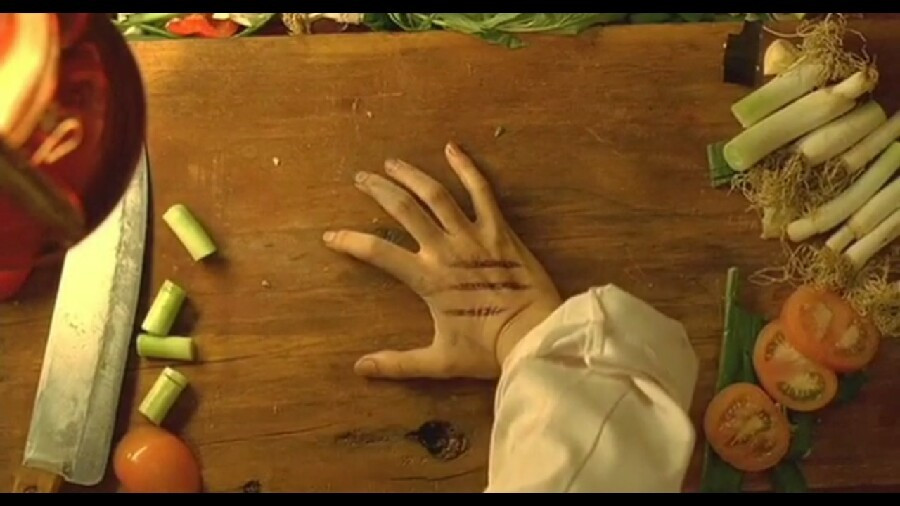 비커와 실린더가 가득한 요리사의 주방은, 주방이라기 보다는 흡사 과학실의 모습을 하고 있다. 여러 차례 이루어 진 실험 끝에, 입맛에 맞는 소스를 개발한 요리사는 본격적으로 조리를 시작한다. 파프리카, 피망, 적양배추, 양파. 야채를 다듬다 검지를 잘라버리지만, 아랑곳 않고 잘린 검지 손가락을 주워 음식물 쓰레기 통 어딘가로 던져 버리는 요리사. 그에게 있어 완벽 추구는 고통에 우선한다.