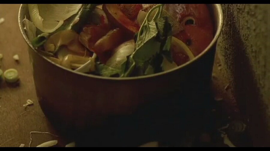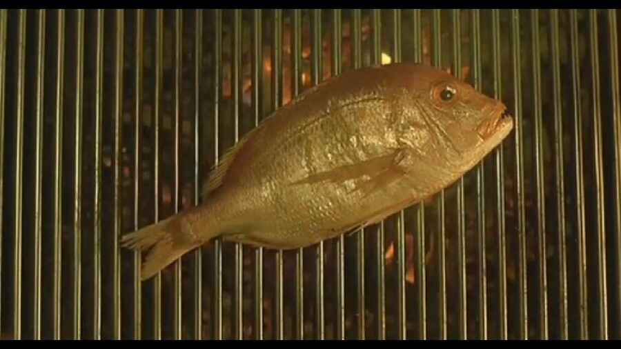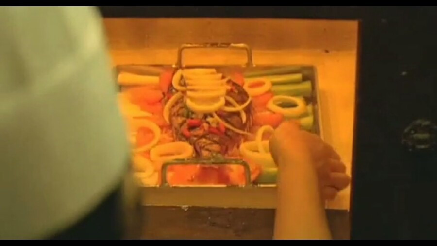 도마 위 도미의 배를 갈라 내장을 정리하고, 조금 거친 비늘은 벗겨낸다. 말갛게 드러난 표피 위로 레몬즙을 발라 산미를 더하고, 토마토원액을 도미의 뱃속에 채워 넣은 뒤, 향긋한 레드 와인을 발라 색감을 살려 준다. 달궈진 그릴에 도미를 굽기 전, 자신의 손등을 얹어 불의 세기를 확인한다. 바싹하게 구워진 살점을 맛 본 요리사는 만족한 표정이다. 그리고 주사위같은 버터 두조각을 팬에 달구어 녹인 후, 도미의 겉면에 버터를 발라 그릴에 굽는다.