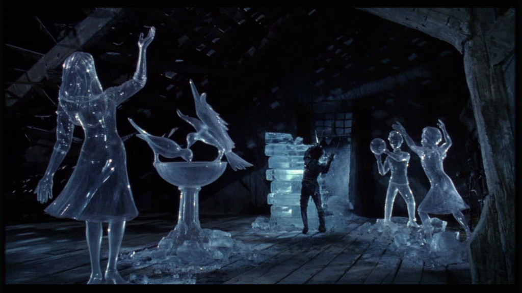 아버지와도 같은 과학자가 죽고나서 오랜기간 상실감과 우울감을 경험했던 에드워드. 남들과는 다른 손 때문에 성 안에서 갇혀살며 햇볕은 구경도 못해보고, 남들은 모두 잠든 새벽녘에나 나와 꽁꽁 언 얼음 덩어리들을 아름답게 조각하는 것이 유일한 낙인 가위손 에드워드. 이 불쌍한 에드워드는 자신을 세상에 드러내지 못하니 자연스럽게 대인 관계는 무너져 버리고, 자존감도 떨어져 버린다.
