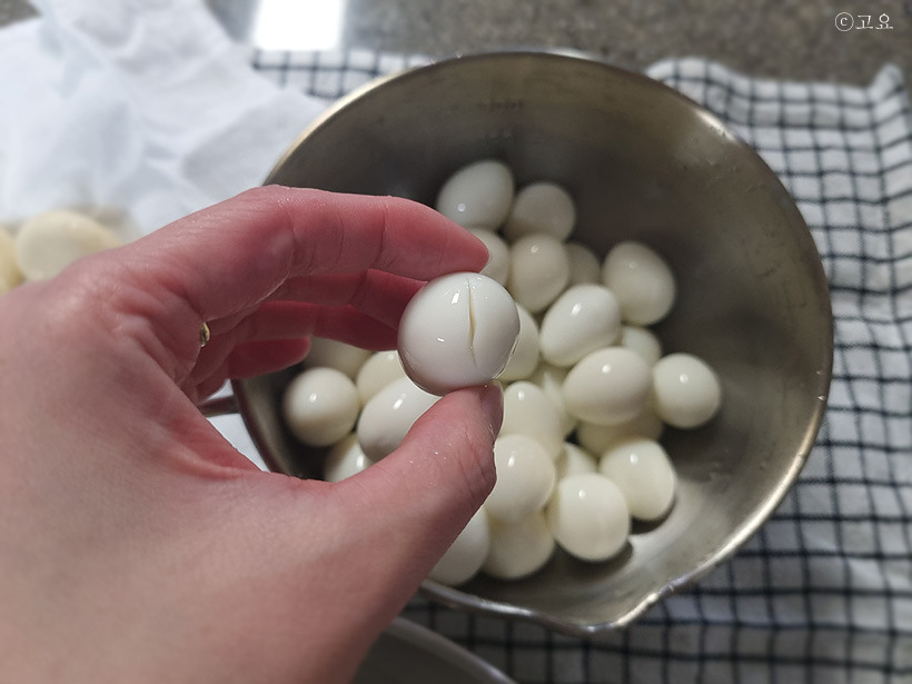 2. 갈라지거나 벗겨져 노른자가 보이는 메추리알은 자칫 비린내가 나고 맛을 해칠 수 있으니 골라내어 사랑스러운 나의 입에 쏙 넣어주자.