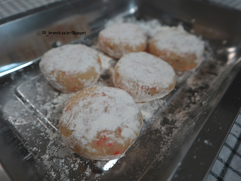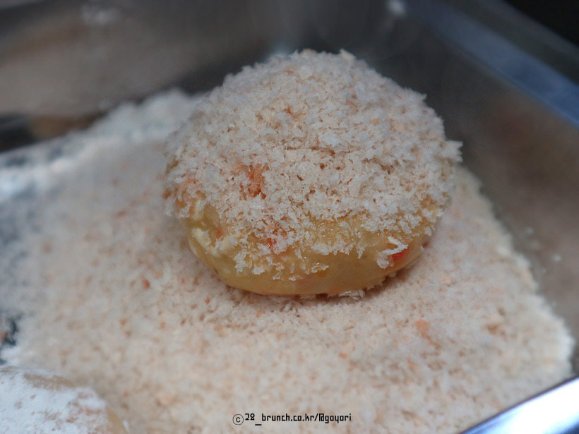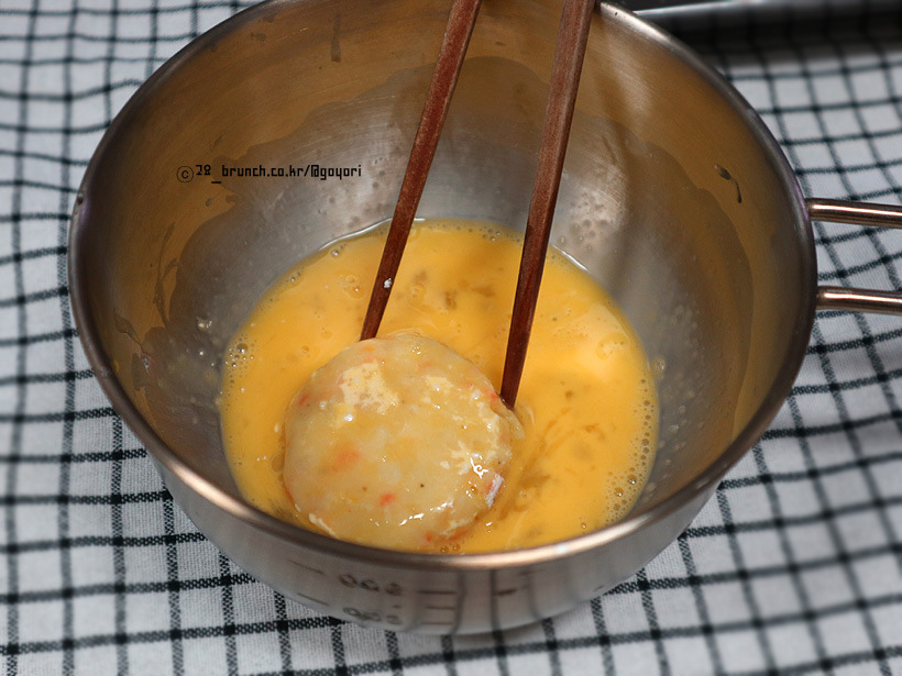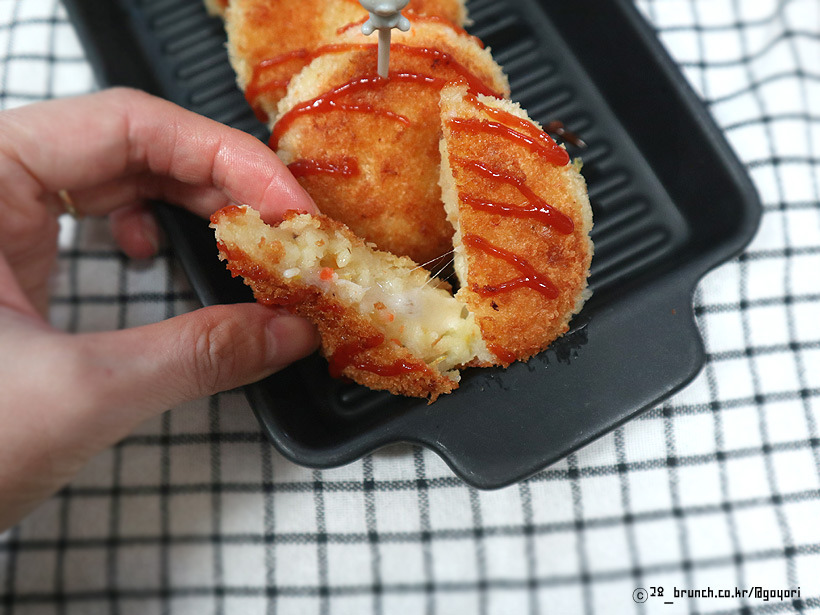 3. 치즈를 넣어 원하는 모양으로 성형한 후에 밀>계> 빵 순서로 튀김옷을 입혀 앞뒤로 바싹하게 튀긴다.