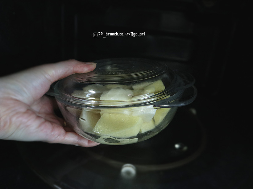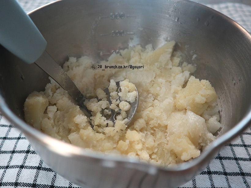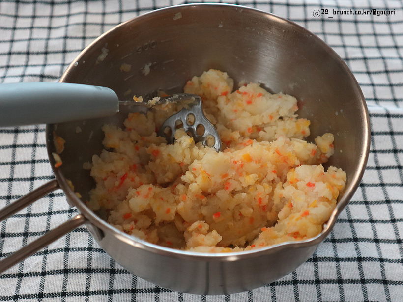 2. 감자를 깍둑 썰어 전자레인지에 익히고, 볶은 채소와 소금, 후추를 넣어 반죽한다.