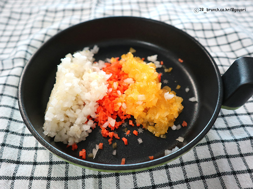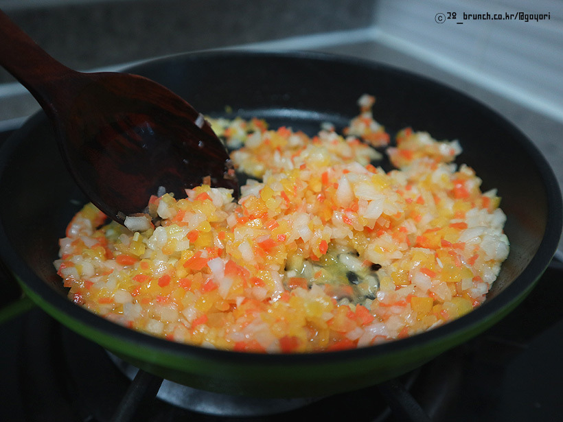 1. 피망보다 식감이 연하고, 단맛이 좋은 파프리카를 사 온다. 색은 노란색이 가장 좋다. 그리고 양파, 당근과 함께 잘게 다진 후에 수분을 날려가며 볶는다. 최대한 잘게 다지는 것이 포인트!!