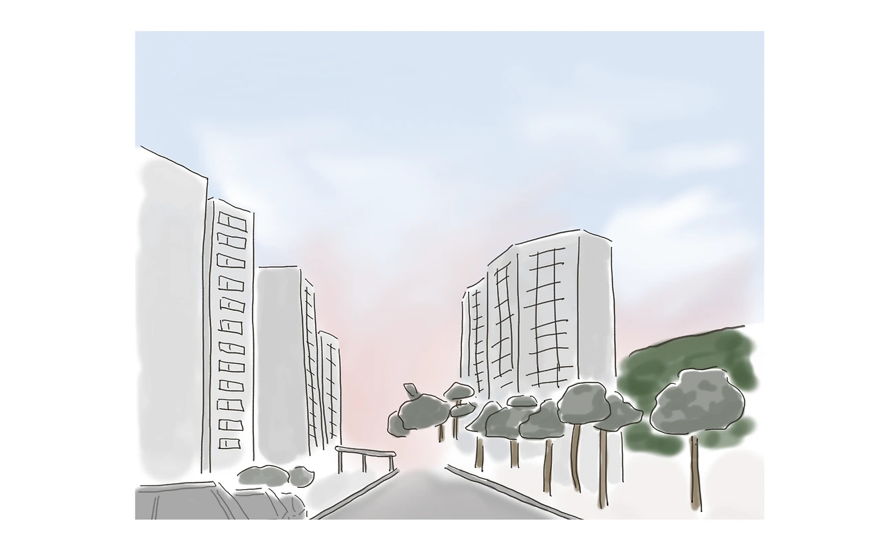 아파트 끝자락부터 퍼지는 핑크빛 노을과 해가 길어져 아직은 밝은 하늘을 보는 순간