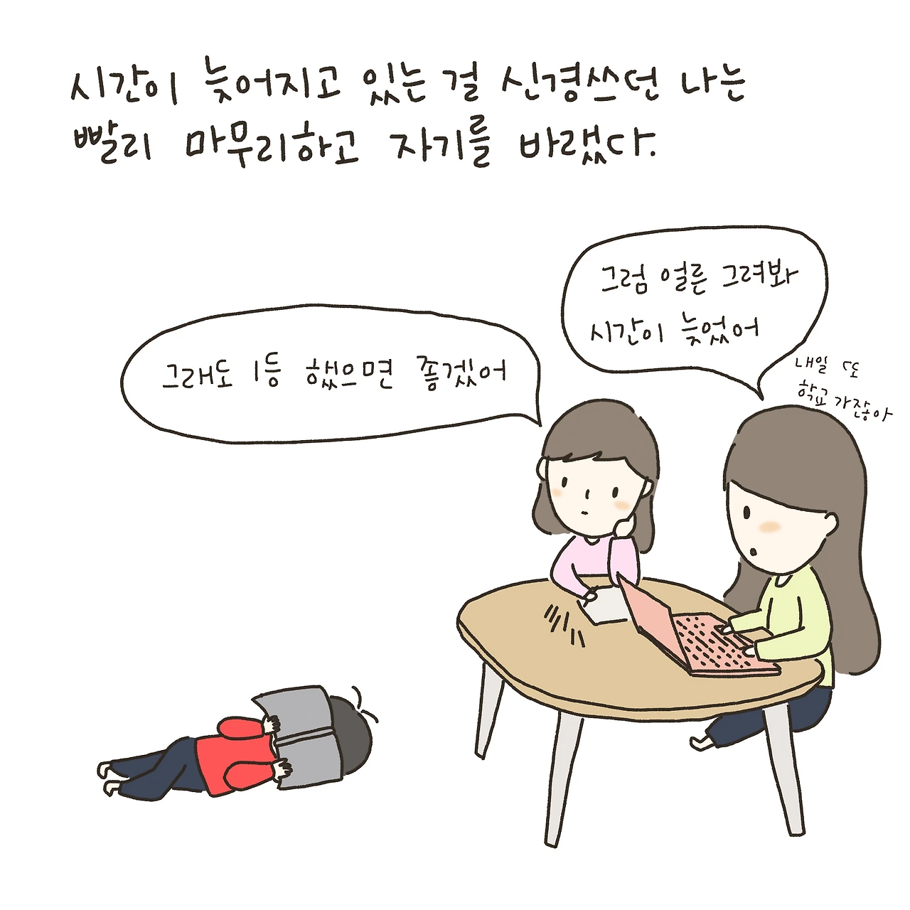 다음날 학교에 가려면 일찍 자고 일찍 일어나야 하는데,