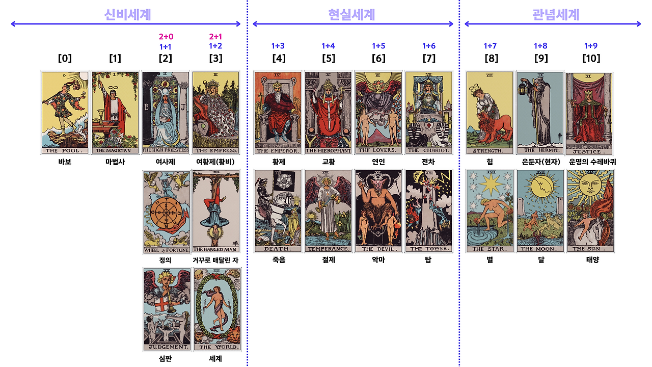 메이저 아르카나는 광대의 여정에서 다양한 심리적 변인을 겪고 성장하지만 수비학적인 의미에 따라 신비세계, 현실세계, 관념세계로 나뉜다고 볼 수 있어요. 수비학적인 뜻과 함께 정리하시라고 이미지 함께 첨부해서 올리며 마쳐보겠습니다!