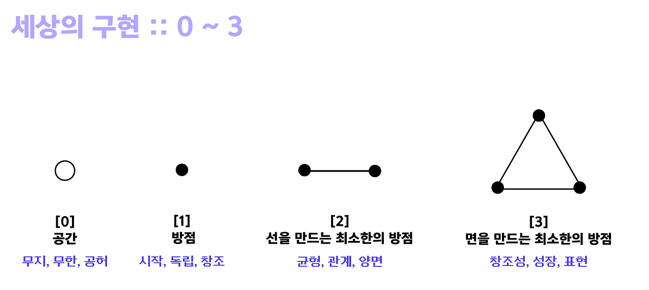 이렇게 0부터 3까지의 숫자들은 빈 공간에서 시작해서 점, 선, 면으로 발전하며 실제 형태가 만들어지는 과정을 보여준답니다. 마치 우주가 생겨나고 발전하는 과정을 설명하는 것 같지 않나요?
