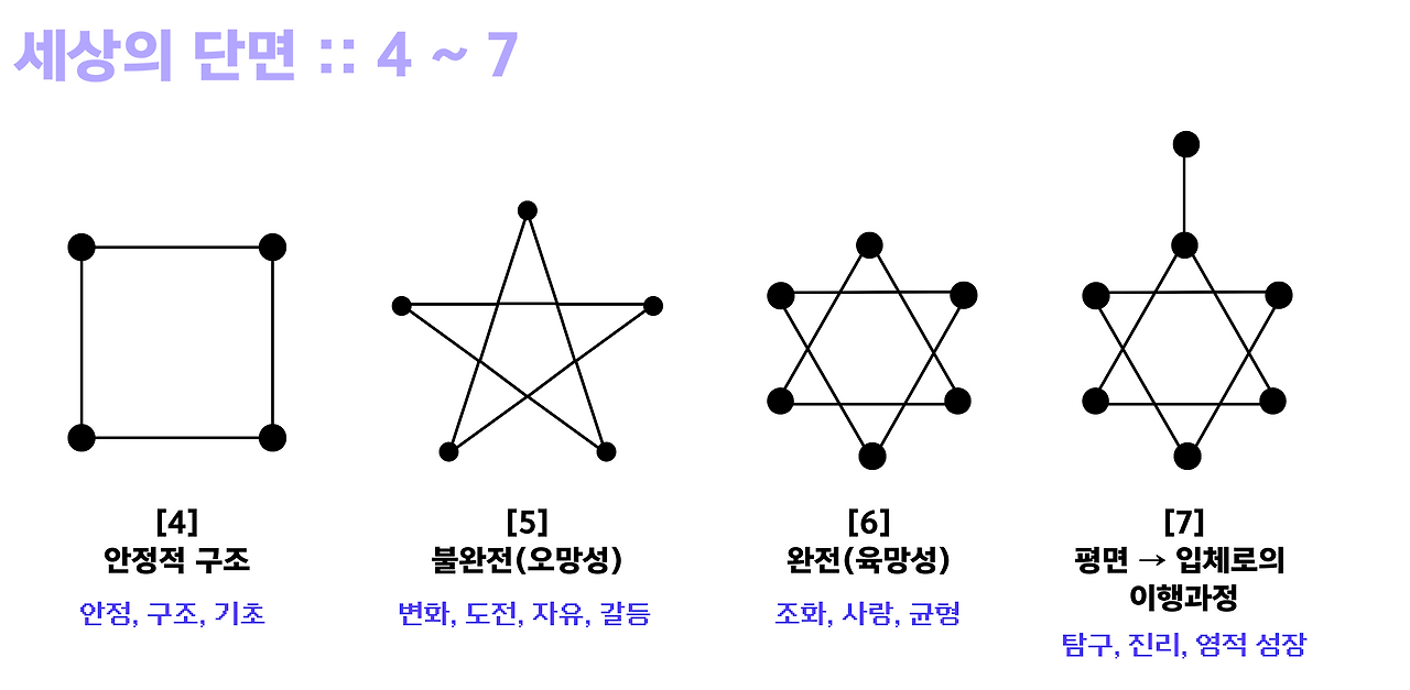 5가 되면 재미있는 일이 일어나요. 안정된 사각형에 변화가 생기기 시작하는 거예요. 마치 춤을 추듯이 움직임이 생기고, 새로운 모양을 탐험하기 시작합니다. 변화를 상징하는 오망성으로 변화하죠. 6이 되면 이 움직이던 도형들이 아주 예쁘게 정리가 돼요. 마치 퍼즐 조각이 딱 맞아떨어지듯이, 삼각형이 조화롭게 겹쳐진 육망성 형태를 띄게 됩니다. 7에 이르면 정말 놀라운 일이 벌어져요. 도형들이 더욱 복잡한 모양으로 가기 위한 준비 단계 자체를 보여주죠. 마치 2차원의 그림이 3차원으로 튀어나오려는 것처럼, 새로운 차원을 탐험하게 되는 거죠.
