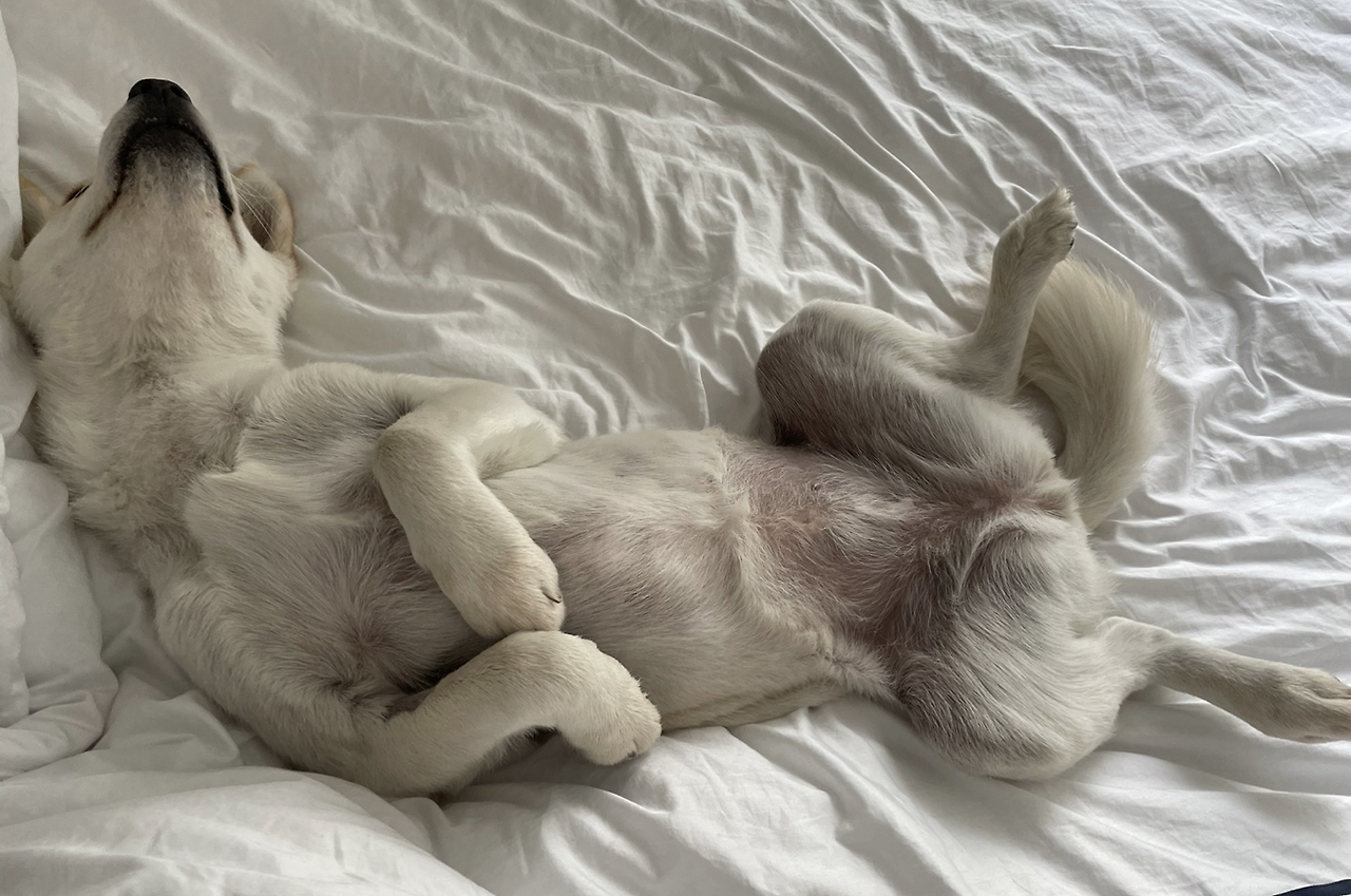 흰둥이가 네 발에 힘을 빼고 옆으로 누워 잘 때 나는 얼굴을 마주 보고 누워 배와 등을 쓰다듬어준다. 점점 얼굴의 근육도 느슨해지고 잠에 빠질수록 더 강해지는 콧김을 받고 있으면 그때만큼 평온한 순간이 없다. 따뜻한 살갗이 닿아 서로가 가지고 있던 긴장은 사라지고 깊이 밤에 빠져든다.