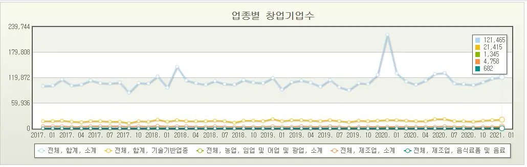 창업에 대한 갈망과 도전의 열기는 늘 존재 해왔습니다. 위 그래프와 같이 매년 10만 개 이상의 스타트업 기업들이 생기고 있습니다. 다만, 2020년 초반 크게 증가했던 창업기업수가 갑작스럽게 줄어든 것은 코로나19 사태 발생 때문인 것으로 보입니다...