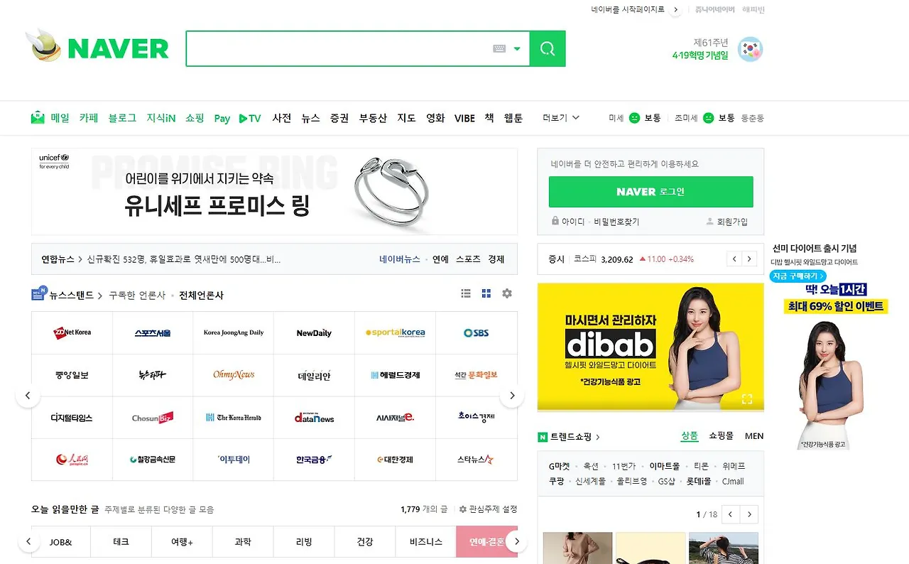 우선 네이버는 첫 화면부터 다양한 정보가 눈에 띕니다. 검색 엔진답게 검색창이 가장 위에 보이고 그 밑에 사용자가 궁금해할 법한 정보들을 카테고리 화한 것이 눈에 띕니다.