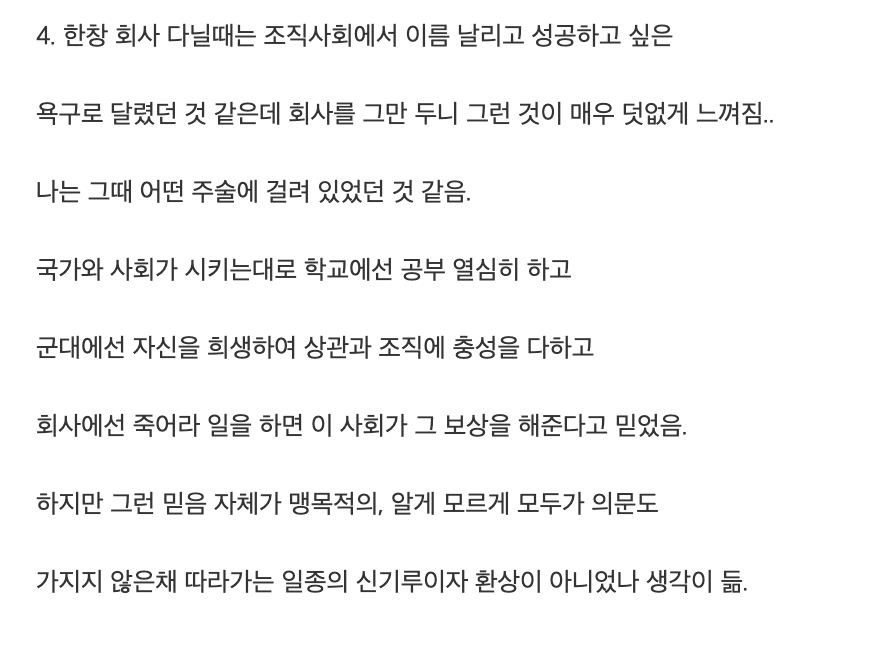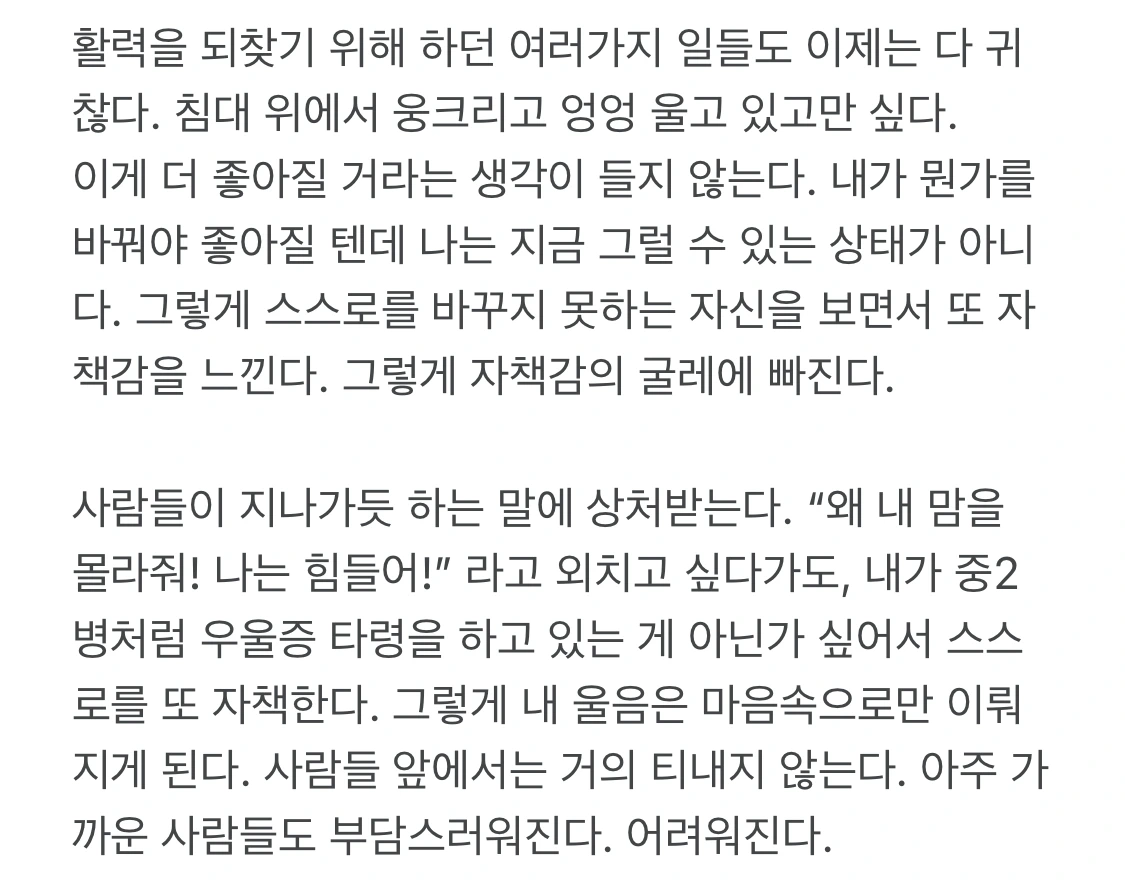 슬프게도 힘들었던 당시에는 그게 번아웃인지도 몰랐다. 번아웃은 매일매일 야근하고, 하루종일 일 생각만 하는 사람에게 오는 건 줄 알았다. 아니면 체력적으로 '번아웃' 되어, 손가락 까딱하기도 힘든 게 번아웃이라고 생각했다. 하지만 나는 그 누구보다 열심히 칼퇴했다. 회사에 1분이라도 더 있을 수가 없었다. 칼퇴를 하니 체력적으로 힘들지도 않았다. 내가 그냥 의지가 약해지고, 게을러진 줄 알았다. 스스로 통제력을 잃었다고 생각해서 자책하기 바빴다. 팀원들 모두 바쁜 와중에 나만 성과를 내지 못한다는 생각에 열등감과 미안함만 느꼈다. 그러면서 우울증도 같이 왔던 거 같은데, 우울증에 걸렸단 사실도 한참 후에야 알았다. 당시에 다른 팀원이 "매일 집에 가서 운다"라고 말하는 걸 들으며 정말 안타까워했는데, 정작 내가 매일 우는 것에는 자각이 없었다. 그렇게 둔했다. 마음의 병에 대해 무지했다. (우울증/번아웃 교육은 국가에서든 회사에서든 정말 꼭 해야 된다고 생각한다.)