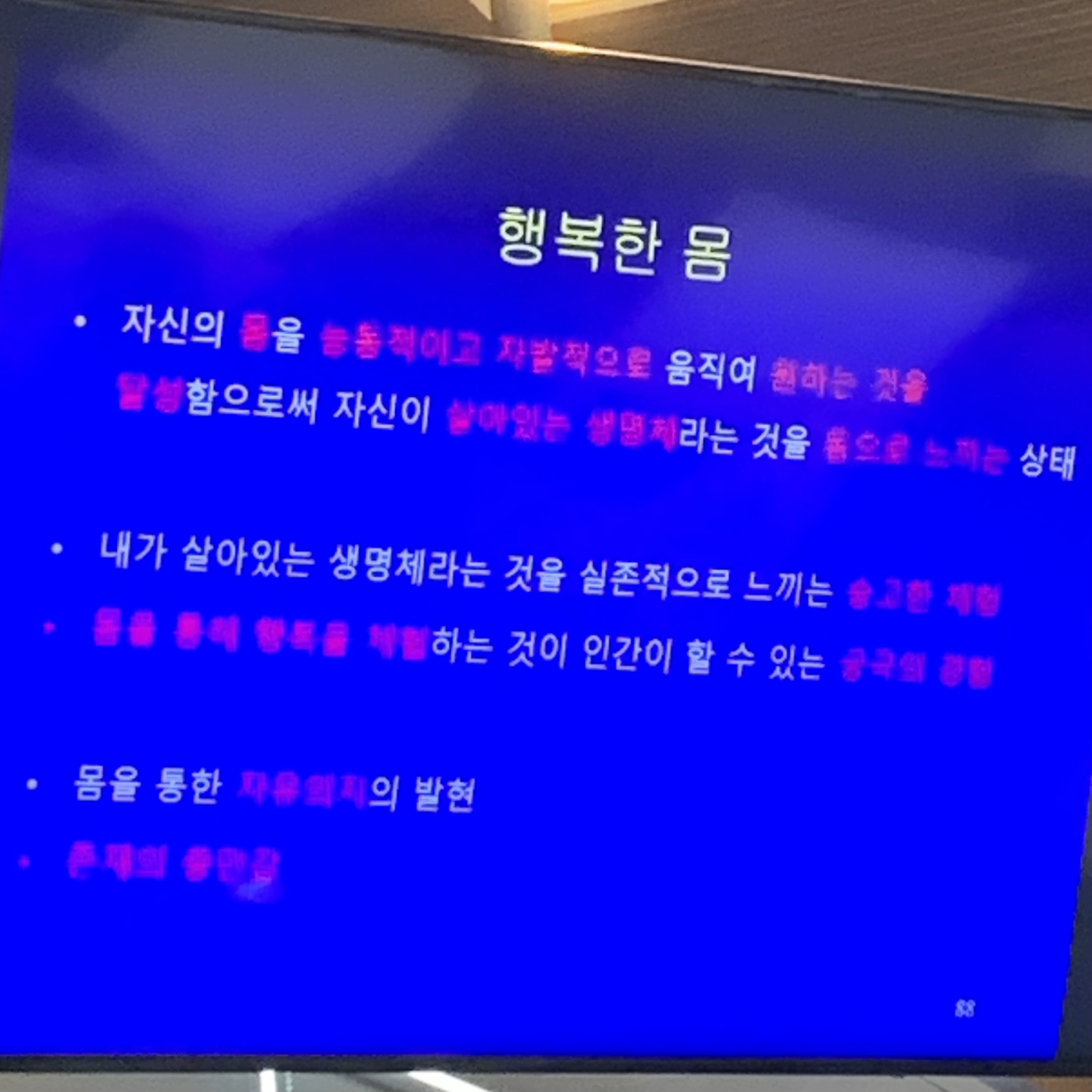너무나 좋은 내용, 기억하고 싶은 내용이 많았지만, 여기 다 옮길 순 없겠지요. 하나 명심할 것은 내가 “행복한 몸”이 되어야 한다는 것입니다. 행복한 몸이란 “자신의 몸을 능동적이고 자발적으로 움직여 원하는 것을 달성함으로써 자신이 살아있는 생명체라는 것을 몸으로 느끼는 상태“라고 설명해 주셨는데요. 몸을 통해 내가 나의 자유의지를 발현할 수 있어야지만, 개인적으로는 행복한 삶을 살 수 있고, 사회적으로는 더 나은 사회를 구현할 수 있다는 것입니다. 머리로는 공감하고, 고민하지만 몸이 움직이지 않는 - 저를 포함한 - 현대인이 다수임을 생각할 때 정말 맞는 해석이라는 생각이 들었습니다.