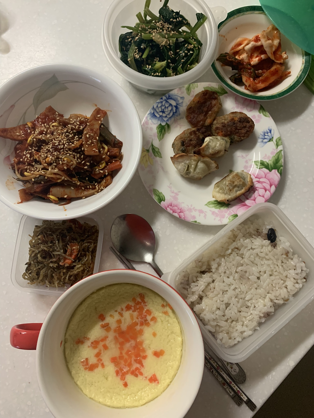 아침: 밥+계란찜+군만두+오징어볶음