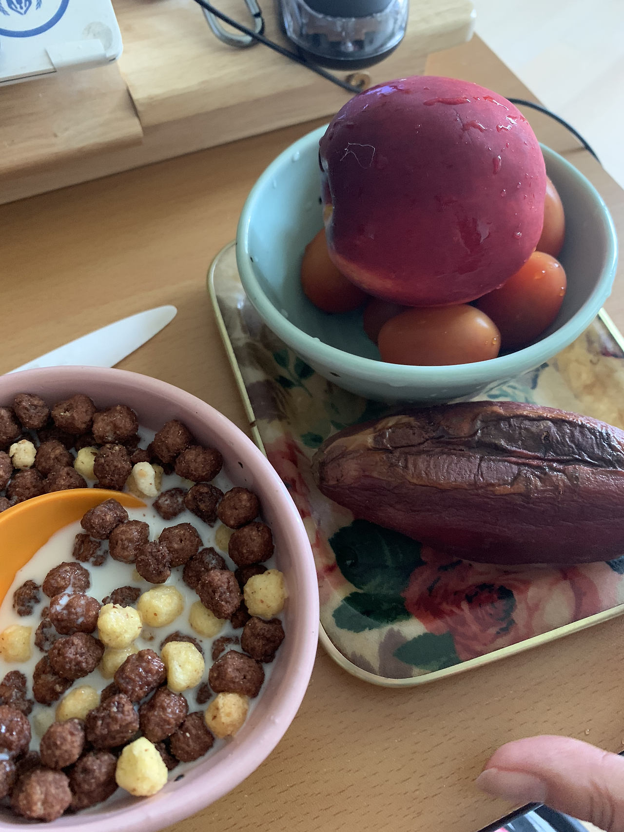 아침: 방토+고구마+천도복숭아+씨리얼+우유
