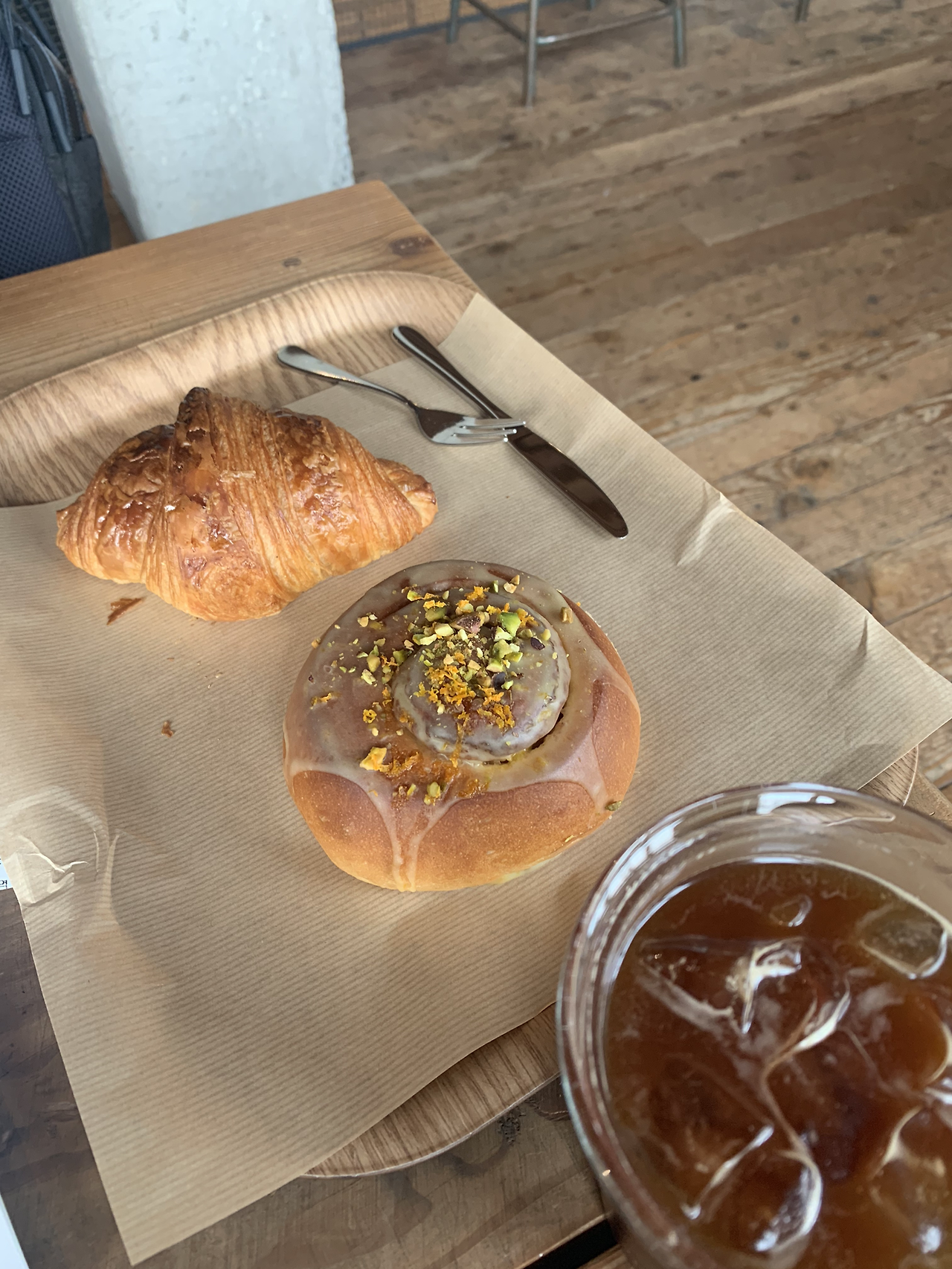 간식: 크로와상+시나몬롤+아아