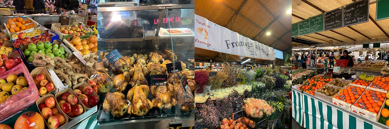 첫 목적지는 토요일마다 서는 로컬마켓이었는데요. 어느 나라를 가던 사람들로 북적거리는 시장은 활기가 있습니다. 각종 식재료들과 과일, 조리된 요리나 부식류는 우리나라에서는 볼 수 없는 것들이죠. 특히 미식의 나라 프랑스에서 파리 로컬 마켓이라니 제 눈은 말 그대로 '돌아갔습니다'. 만약 장을 보러 간 거였더라면 로스트 치킨부터 다양한 치즈가 들어간 요리, 과일과 채소까지 왕창 샀을 거예요. 가격도 마트보다 저렴하고 품질도 좋다고 하더라고요. 하지만 다음 일정이 있기 때문에 눈호강 하는 것만으로 참았습니다.